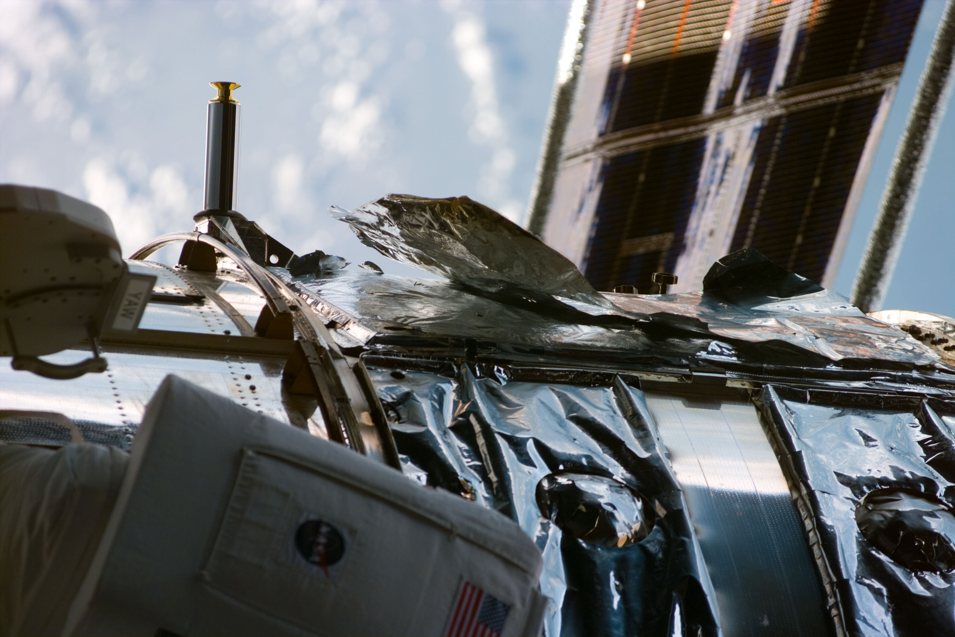 S82-E-5369 (15 Feb. 1997) --- This photograph, taken from onboard the Space Shuttle Discovery with an Electronic Still Camera (ESC) shows a tear in the thermal insulation of the Hubble Space Telescope (HST) Bay #8.