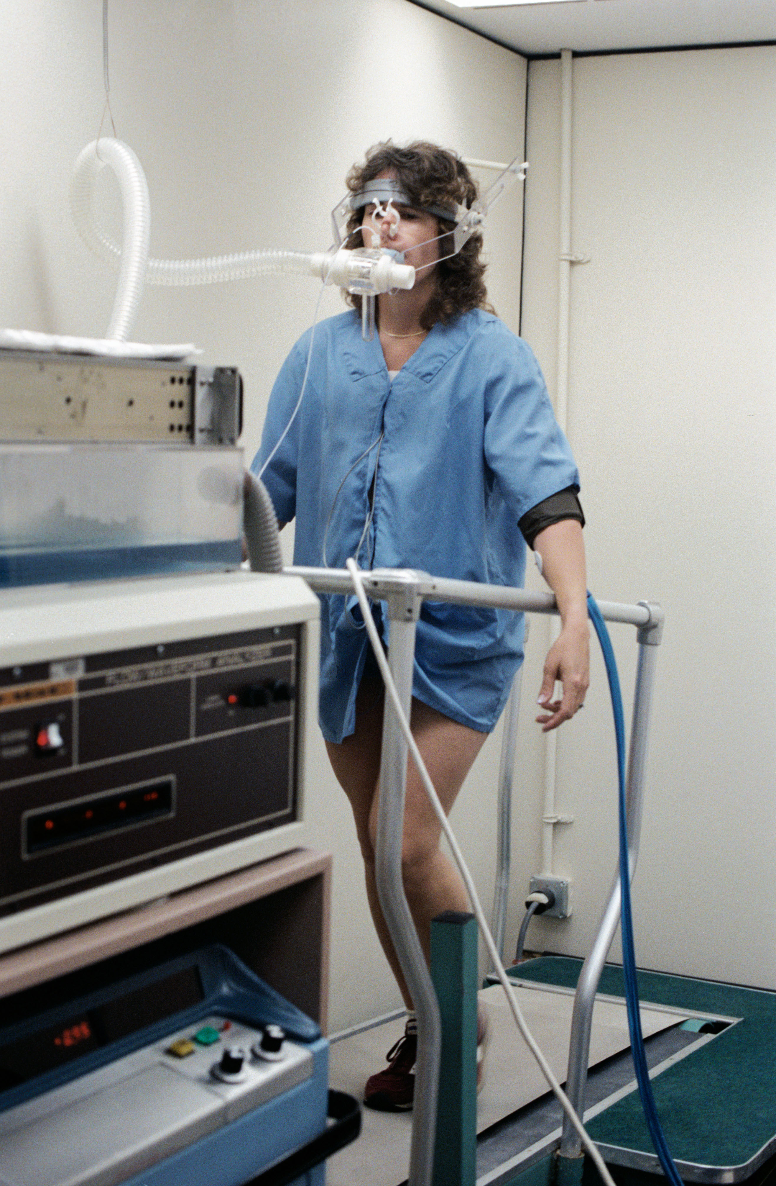 S85-37165 (8-12 July 1985) -- Sharon C. (Christa) McAuliffe of Concord High, Concord, New Hampshire, runs in place on treadmill to test physiological responses at Johnson Space Center. Christa McAuliffe was eventually chosen as the first Teacher in Space and was a member of the seven-member Challenger shuttle crew which died tragically in the explosion of the spacecraft during the launch of STS-51L from the Kennedy Space Center about 11:40 a.m., EST, on Jan. 28, 1986. The explosion occurred 73 seconds into the flight as a result of a leak in one of two Solid Rocket Boosters that ignited the main liquid fuel tank. The crew members of the Challenger represented a cross-section of the American population in terms of race, gender, geography, background, and religion. The explosion became one of the most significant events of the 1980s, as billions around the world saw the accident on television and empathized with any one of the several crew members killed. Photo credit: NASA