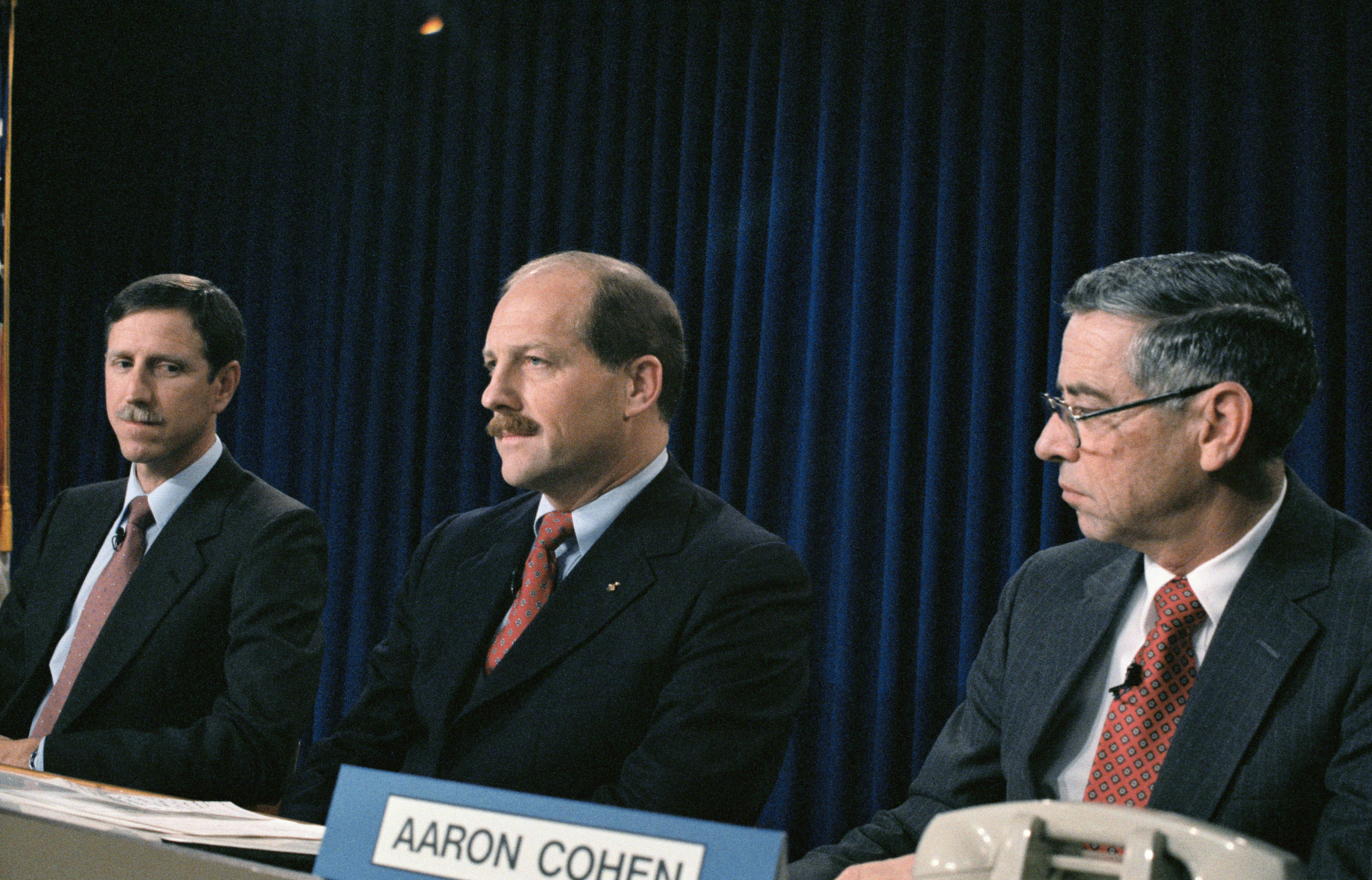 STS-26 Discovery, Orbiter Vehicle (OV) 103, crew including Commander Frederick H. Hauck and Pilot Richard O. Covey and JSC Director Aaron Cohen participate in press conference held at JSC Auditorium and Public Affairs Facility Bldg 2. Hauck and Covey are shown with Cohen as they ponder queries from news media representatives during the first press conference for the group since the mission's announcement last week. Left to right are Covey, Hauck, and Cohen.