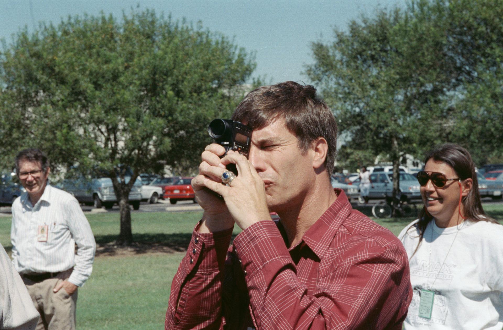 S88-52476 (8 Nov 1988) --- John E. Blaha, STS-29 pilot, gets in some training on the operation of one of the payloads for his upcoming spaceflight aboard Discovery. The payload is an Imax motion-picture camera, hardware of which is out of frame here. Blaha uses a light meter to get a reading before operating the camera in a practice run. The crew met with Imax personnel on the JSC grounds to practice using the motion-picture camera, making its first post-Challenger trip into space. Phyllis Wilson with Imax is at far right. The payload flew on a number of earlier STS flights.