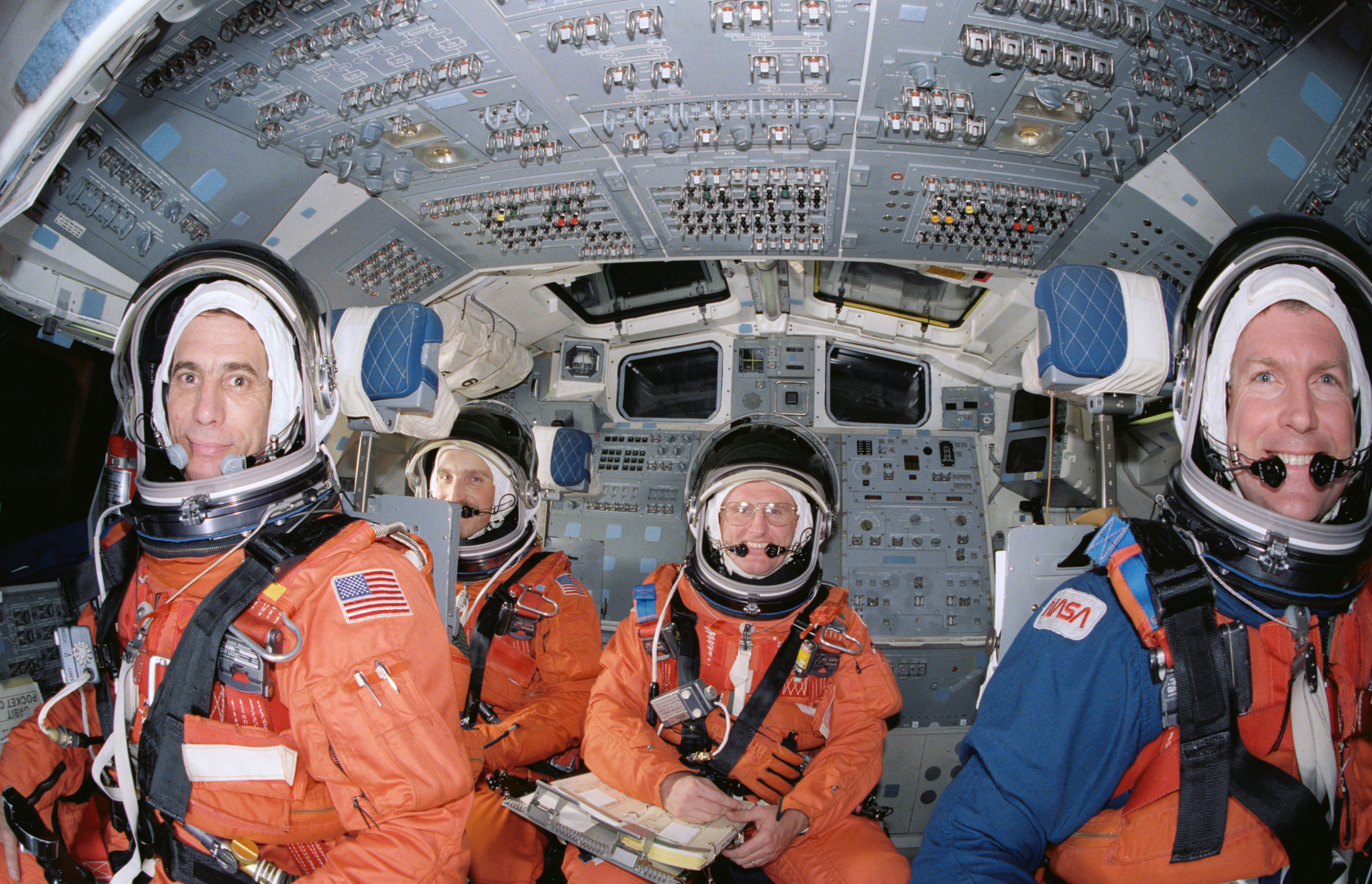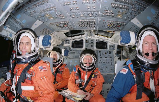 S89-26389 (Jan 1989) --- Four of five crewmembers for STS-29 pause during launch and entry phase rehearsals in the crew compartment trainer at the Johnson Space Center. The astronauts are in their entry positions, while the fifth (out of frame) remains strapped into a chair on the mid deck. In front are John E. Blaha (left), pilot, and Michael L. Coats, mission commander. Behind them are James P. Bagian (left), and James F. Buchli, both mission specialists. Robert C. Springer, the third mission specialist, is on the mid deck. He will occupy Discovery's middeck for entry phase, while Bagian will occupy that post for launch. Photo was made by Bill Bowers of the Johnson Space Center.