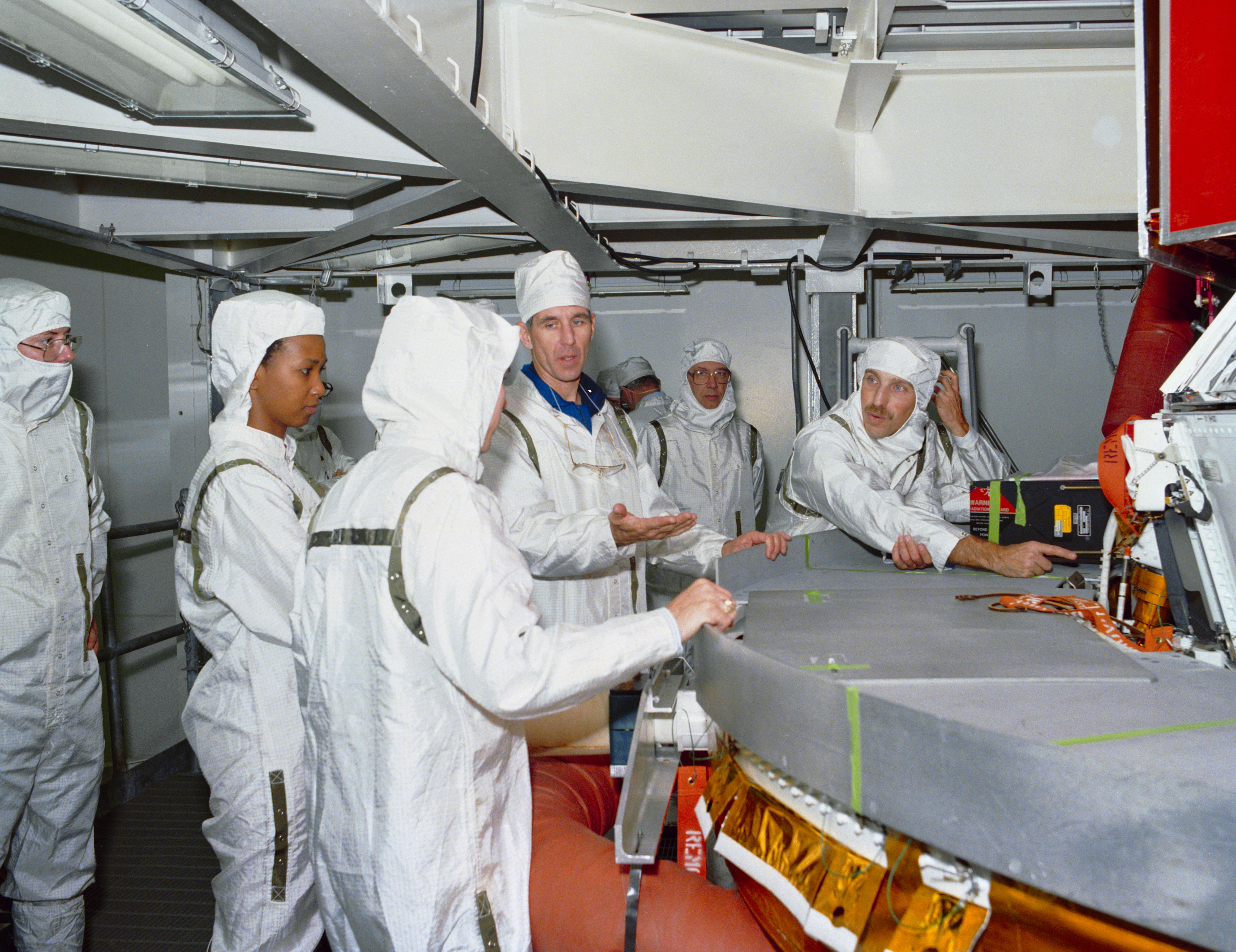 S89-28108 --- Astronaut Mae C. Jemison and STS-29 Mission Specialist James P. Bagian and Robert C. Springer inspect the interface between the tracking and data relay satellite D (TDRS-D) and inertial upper stage (IUS-9) in a test cell located in the Kennedy Space Center (KSC) Vertical Processing Facility (VPF). The clean-suited astronauts, engineers, and technicians discuss the payload. Photo credit: NASA