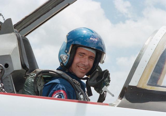 STS-28 Columbia, Orbiter Vehicle (OV) 102, Commander Brewster H. Shaw, wearing navy blue flight coveralls and helmet, sits in T-38A forward cockpit. Shaw, along with his fellow crewmembers, is preparing for departure from Ellington Field to Kennedy Space Center (KSC). STS-28, a Department of Defense (DOD) dedicated mission, is scheduled for launch on 08-08-89.