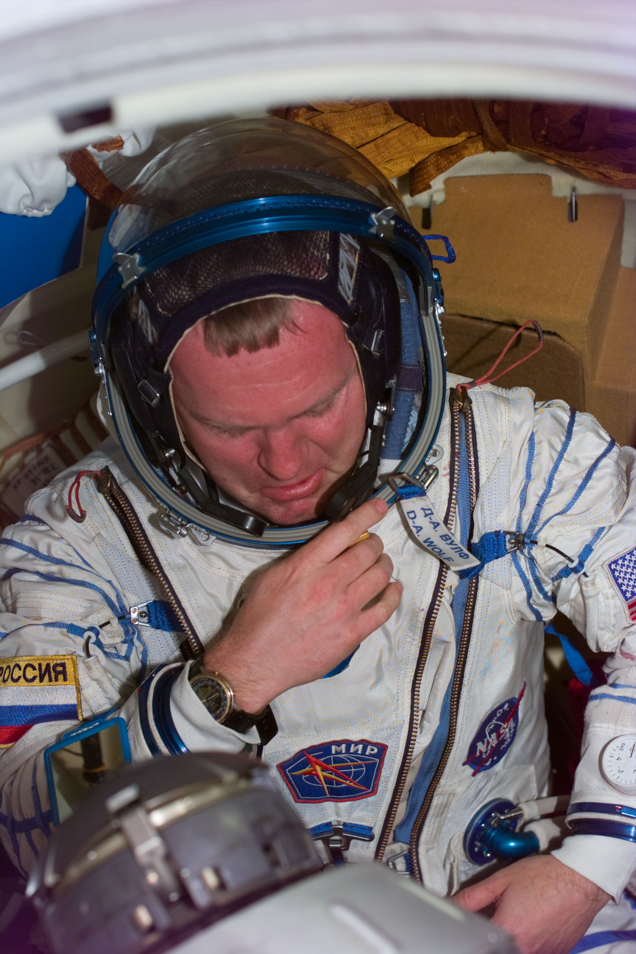 S89-E-5215 (25 Jan 1998) --- Astronaut Andrew S. W. Thomas dons the Sokol spacesuit of David A. Wolf, who has been onboard Russia's Mir Space Station since September 1997. An earlier fit check of Thomas' Sokol suit did not initially meet specifications required in the event he has to spend time in the pressurized Soyuz spacecraft, now docked to Mir. After Thomas was checked out in Wolf's suit, sizing modifications were made to his own suit and it was then verified for use by Thomas in the event of a contingency. The image was taken with an Electronic Still Camera (ESC) at 17:58:58 GMT, January 25, 1998.