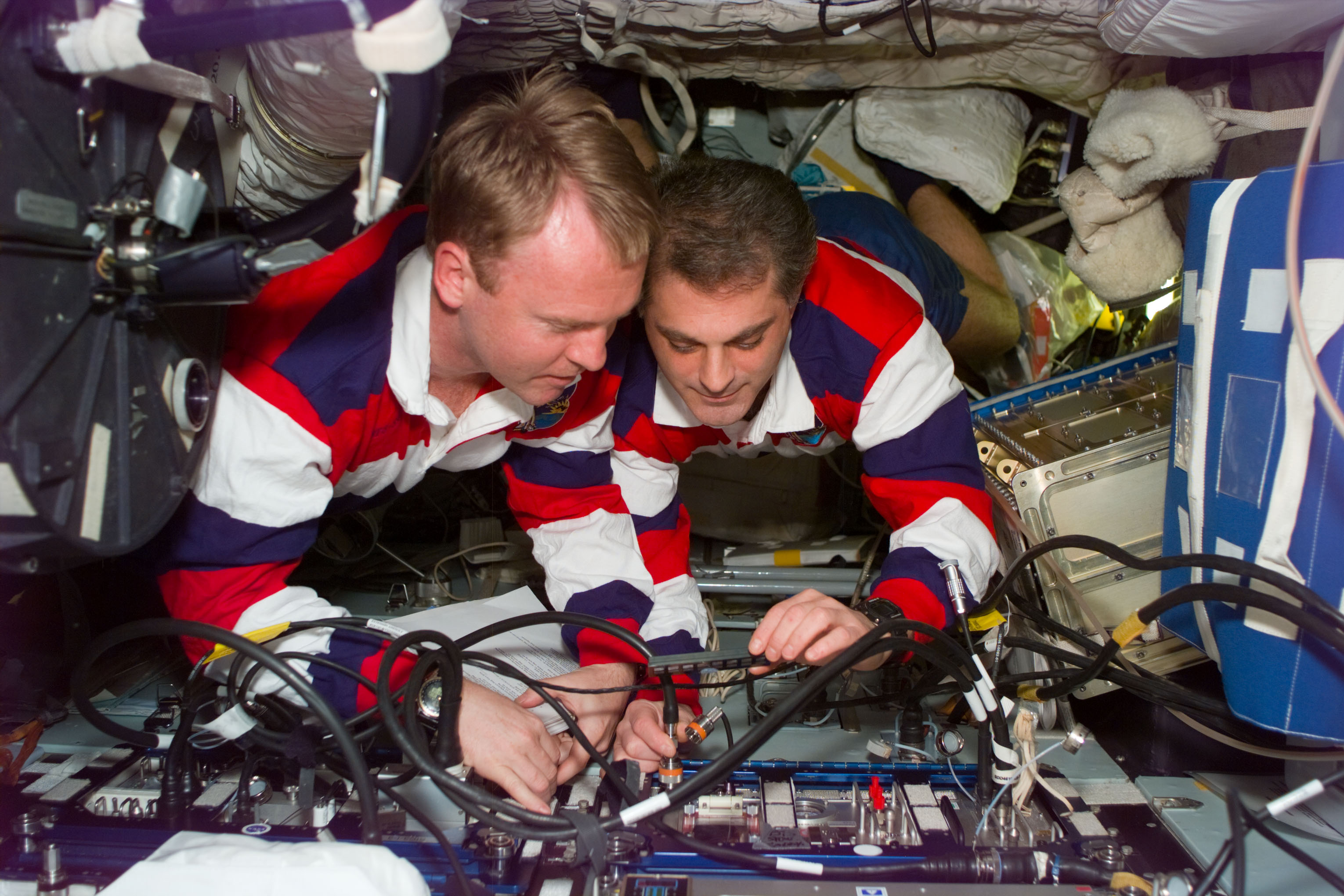 S89-E-5320 (26 Jan 1998) --- This Electronic Still Camera (ESC) image shows astronauts and cosmonaut guest researchers Andrew S. W. Thomas (on left) and David A. Wolf during hand-over operations onboard the Russian Mir Space Station. Wolf is explaining the operations of this equipment to Thomas. Thomas, replacing Wolf as cosmonaut guest researcher, will be the last American astronaut to serve a tour aboard the Mir. This ESC view was taken on January 26, 1998, at 15:58:39 MET.