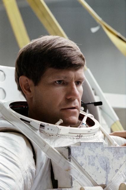 S90-46036 (Aug 1990) --- Astronaut Donald R. McMonagle awaits arrival of helmet gear for his extravehicular mobility unit (EMU) spacesuit as he prepares to be lowered into a 25-ft. deep pool at the Johnson Space Center's weightless environment training facility (WET-F). McMonagle was preparing to participate in the simulation of a contingency extravehicular activity (EVA) for the mission, scheduled for Discovery in the spring of 1991.