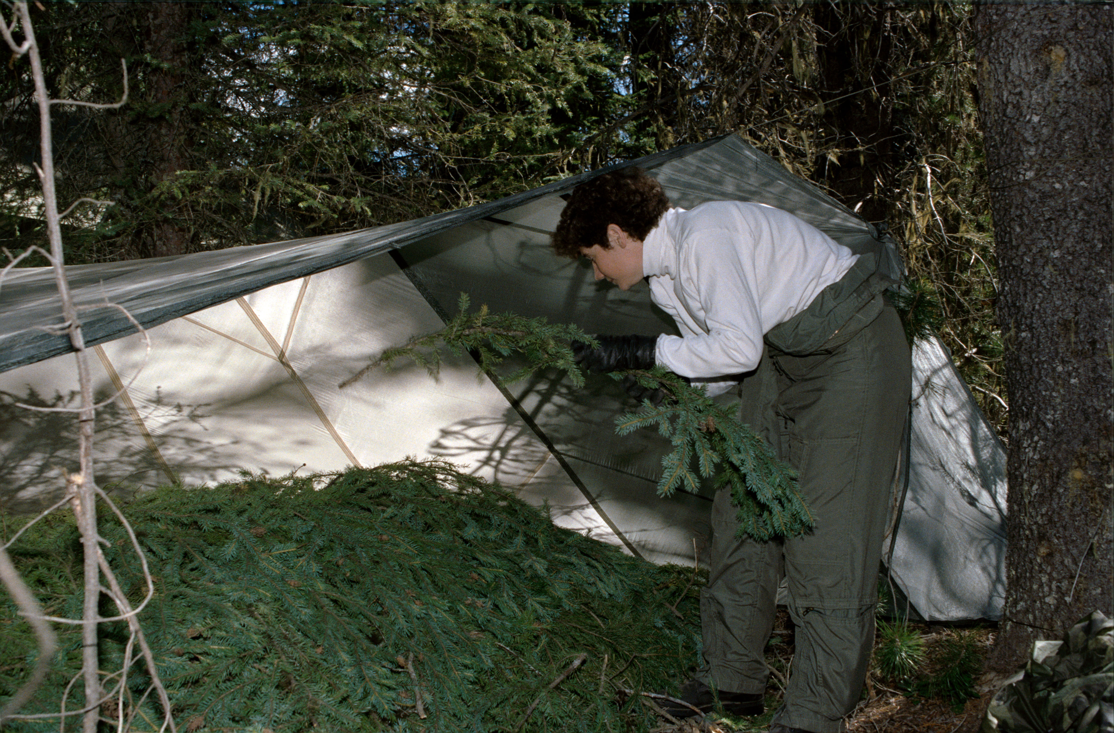 1990 Group 13 Astronaut Candidate (ASCAN) Susan J. Helms gathers pine branches to create bedding under a tent she has constructed from a parachute. Helms, along with her classmates, is participating in wilderness survival training at Fairchild Air Force Base (AFB) Spokane, Washington. The training was conducted in the mountain forests of Washington from 08-26-90 through 08-30-90.