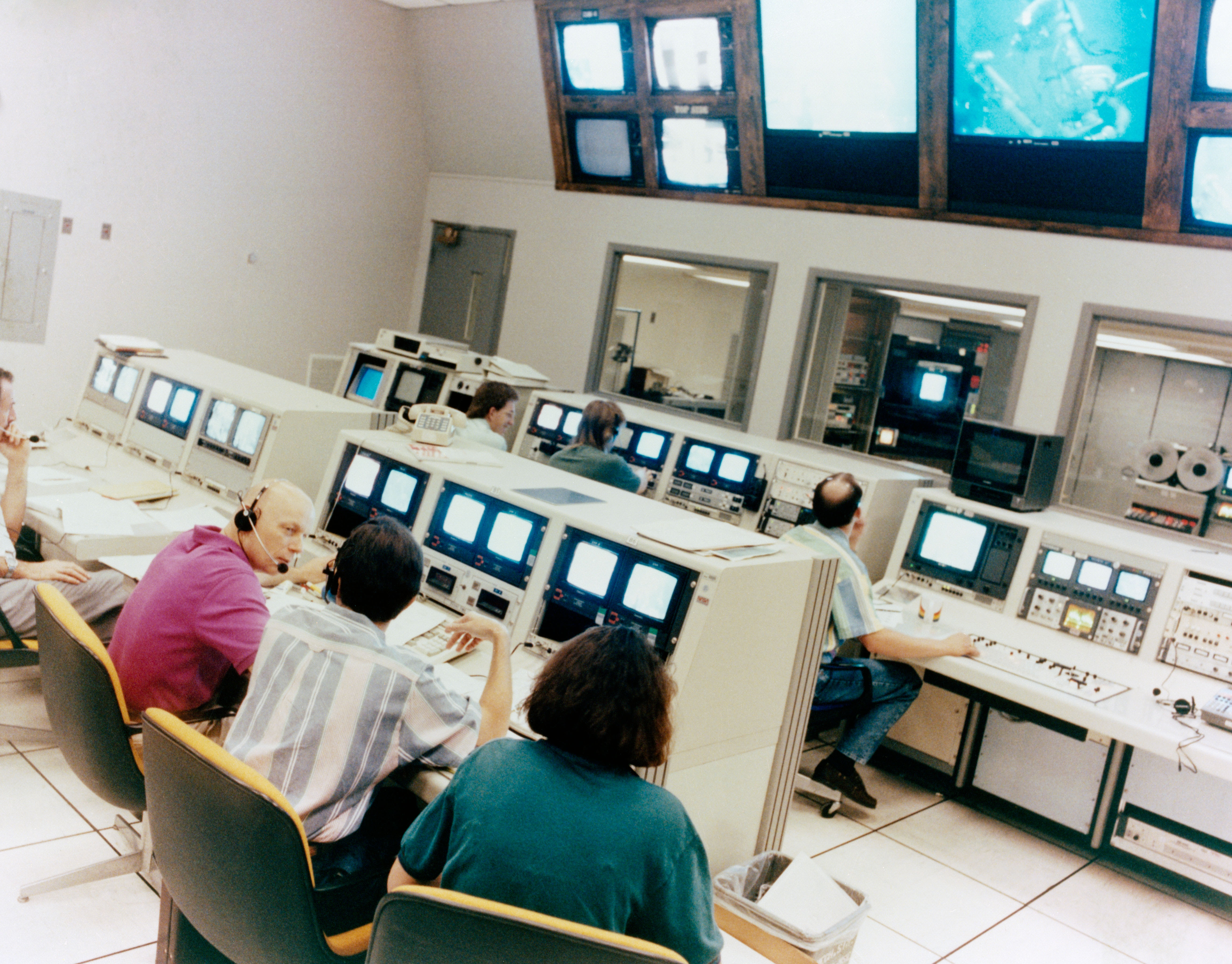 Astronauts Jeffrey A. Hoffman (far left) and F. Story Musgrave (second left) monitor a training session from consoles in the control room for the Neutral Buoyancy Simulator (NBS) at the Marshall Space Flight Center (MSFC). Seen underwater in the NBS on the big screen and the monitors at the consoles is astronaut Thomas D. Akers. The three mission specialists, along with astronaut Kathryn C. Thornton, are scheduled to be involved in a total of five sessions of extravehicular activity (EVA) to service the Hubble Space Telescope (HST) in orbit during the STS-61 mission, scheduled for December 1993.
