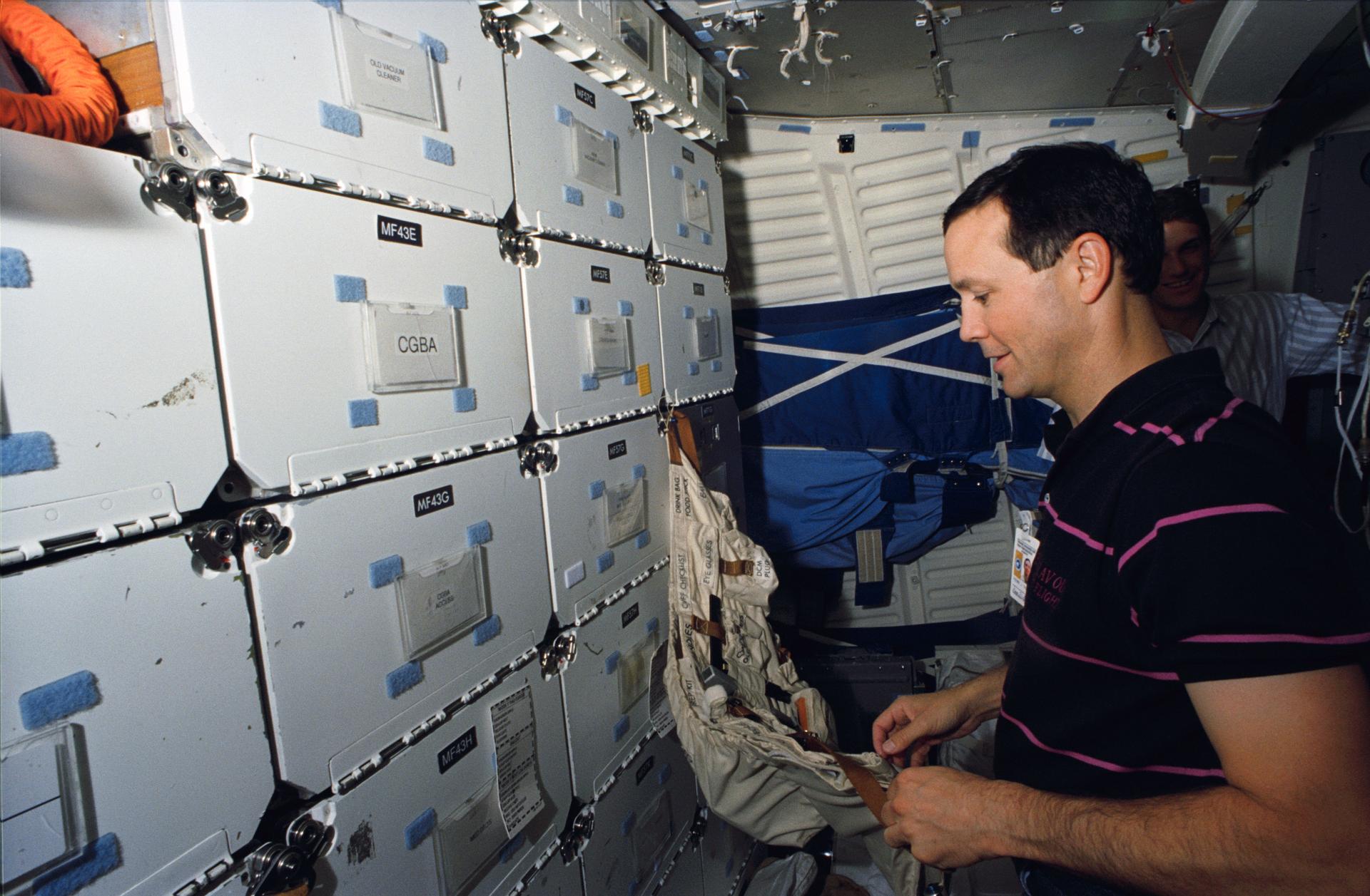 S93-46017 (13 October 1993) --- In the Johnson Space Center's (JSC) Shuttle mockup and integration laboratory, astronaut Pierre J. Thuot retrieves gear to rehearse a suit donning exercise on the middeck. Thuot's very realistic environs are provided by the Shuttle crew compartment trainer. Thuot, mission specialist, and four other NASA astronauts will spend two weeks in space aboard the Columbia in March of next year. He and astronaut Andrew M. Allen have been rehearsing contingency space walks. There is no scheduled extravehicular activity for the STS-62 flight.