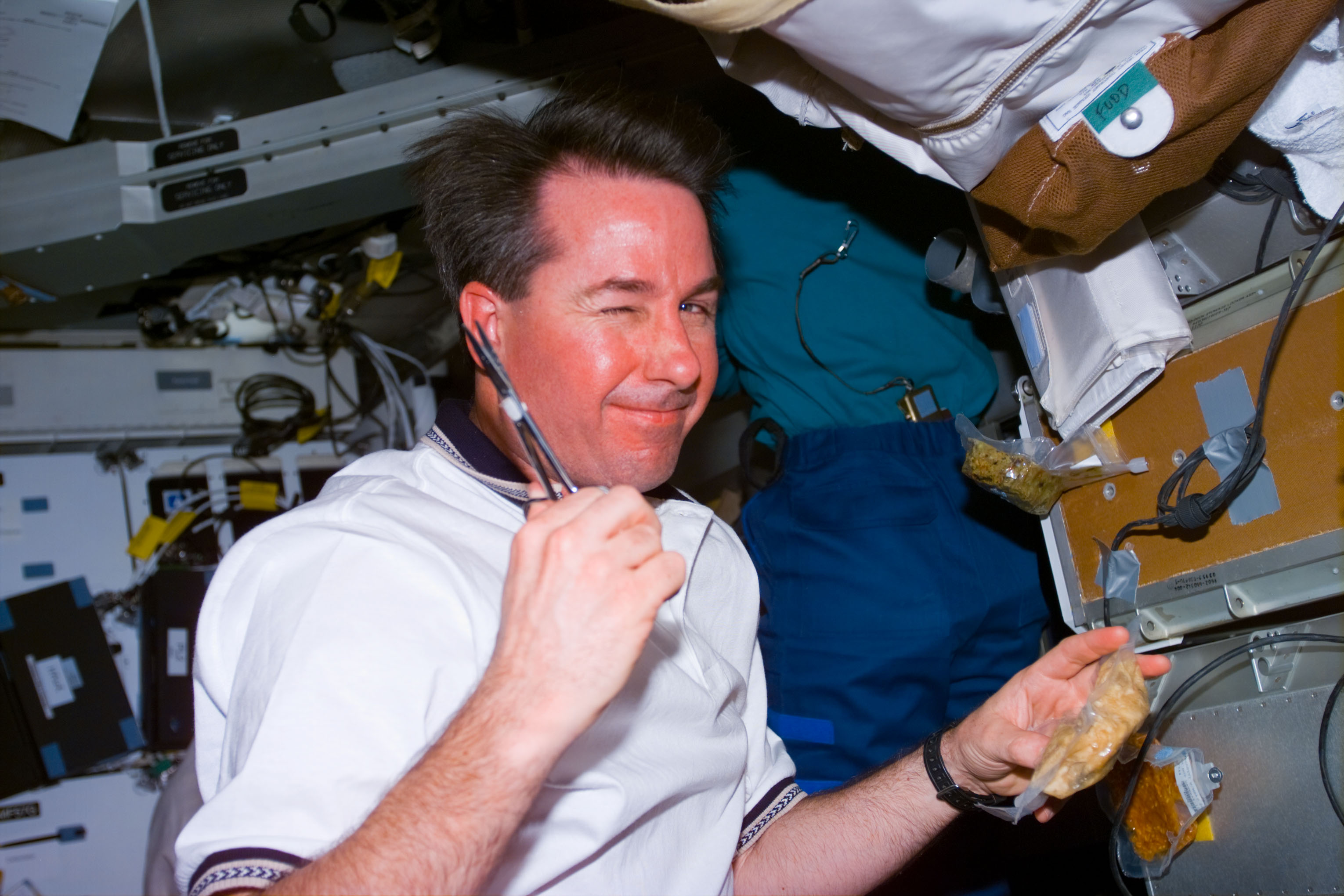 STS095-E-5124 (31 Oct. 1998) --- Astronaut Stephen K. Robinson, STS-95 mission specialist, with scissors and food packet on Discovery's middeck. The photo was taken with an electronic still camera (ESC) at 9:52:20 GMT, Oct. 31.