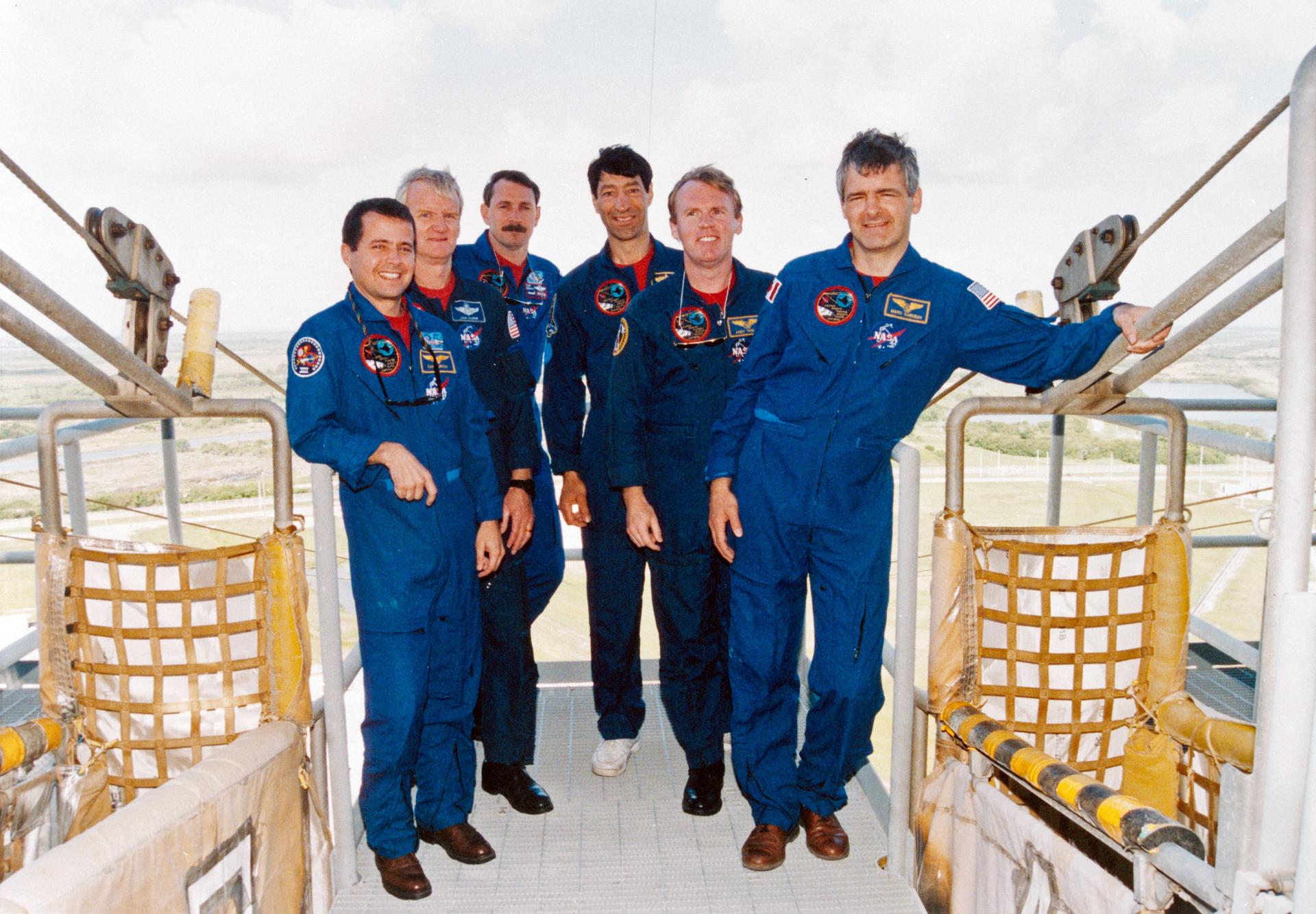 S96-08026 (22 April 1996) --- The STS-77 crew take time out from Terminal Countdown Demonstration Test (TCDT) activities to pose for a group portrait next to the slidewire baskets on the emergency egress system at the 195-feet level of Launch Pad 39B, at the Kennedy Space Center (KSC). From the left are astronauts Daniel W. Bursch, mission specialist; John H. Casper, commander; Curtis L. Brown, Jr., pilot; Mario Runco, Jr., mission specialist; Andrew S. W. Thomas, mission specialist; and Marc Garneau, mission specialist representing the Canadian Space Agency (CSA). The Space Shuttle Endeavour is undergoing preparations at Pad 39B for liftoff on the fourth Shuttle flight of 1996 around May 16, 1996.