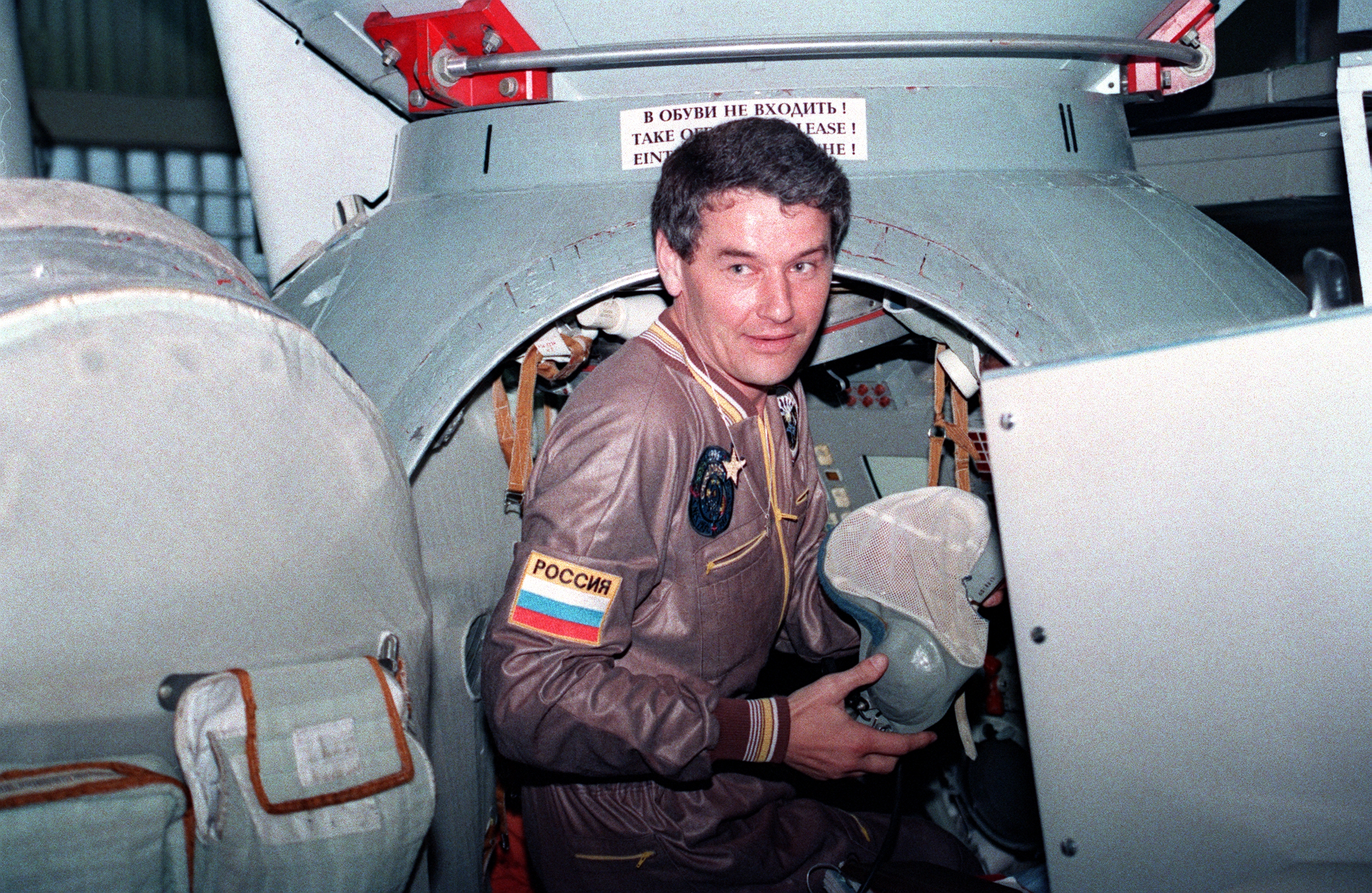 S96-13233 (July 1996) --- Cosmonaut Valeri G. Korzun egresses a trainer at the Yuri Gagarin Cosmonaut Training Center in Russia. Korzun is Mir-24 commander. EDITOR'S NOTE: Since this photograph was taken cosmonauts Korzun and Aleksandr Y. Kaleri were named to replace the original Mir-22 crew. Along with French spationaut Claudie desHayes, the two joined NASA astronaut Shannon W. Lucid onboard the Mir space station in August.