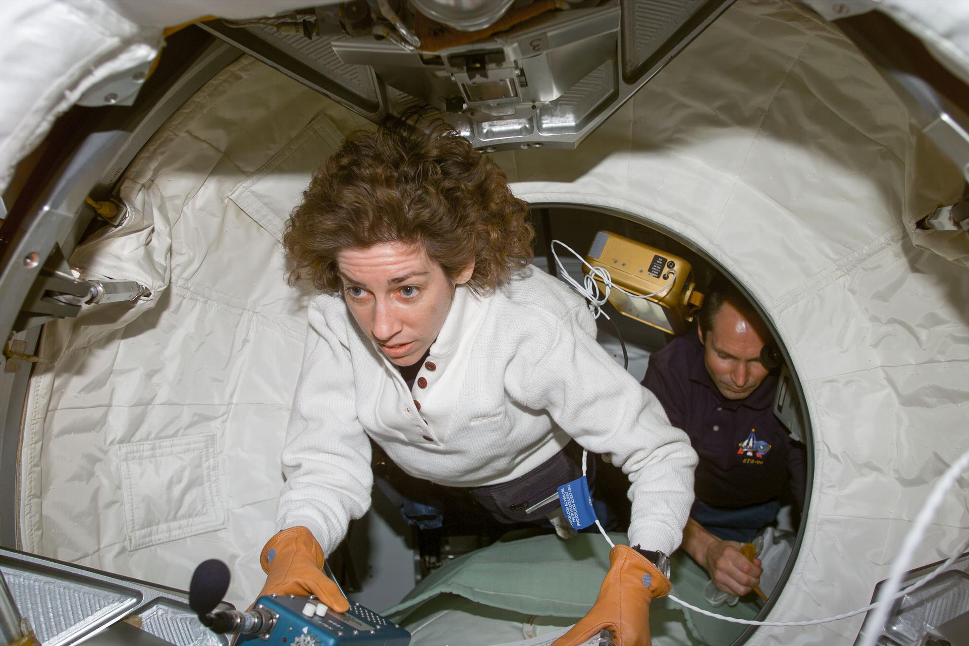 S96-E-5031 (29 May 1999) --- Astronaut Ellen Ochoa and cosmonaut Valery I. Tokarev return to the space shuttle Discovery after a brief intravehicular trip to the Pressurized Mating Adapter 2 (PMA 2) on flight day four. The photo was recorded with an electronic still camera (ESC) at 07:02:52 GMT, May 29, 1999. Photo credit: NASA