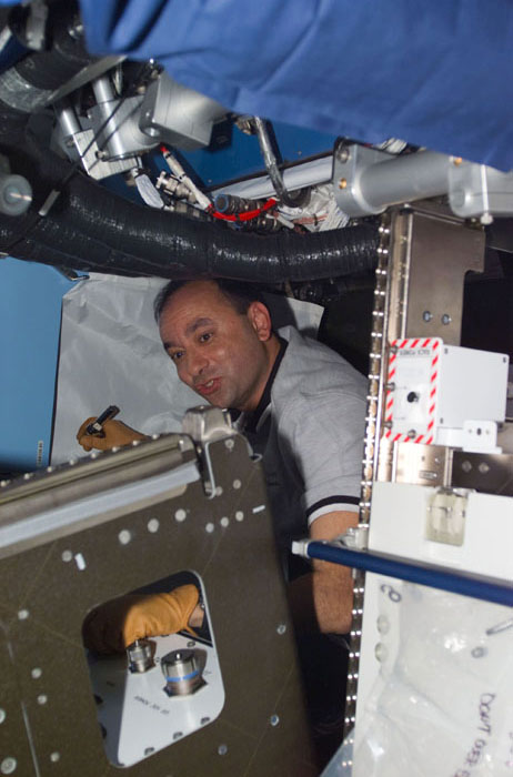 STS98-E-5159 (11 February 2001) --- Astronaut Mark L. Polansky, STS-98 pilot, works inside the newly attached Destiny laboratory onboard the International Space Station (ISS). After the Destiny hatch was opened early in the day, members of both the shuttle and station crews went to work quickly inside the new module, activating air systems, fire extinguishers, alarm systems, computers and internal communications. The crews also took some photos and continued equipment transfers from the shuttle to the station. The scene was taken with a digital still camera.
