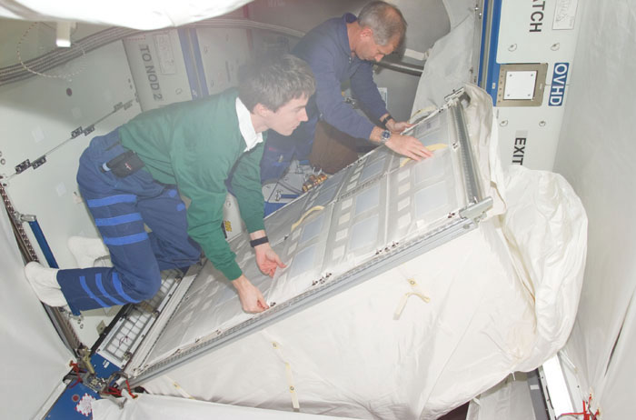STS98-E-5250 (15 February 2001) --- Astronaut Kenneth D. Cockrell (left), STS-98 mission commander, teams with cosmonaut Sergei K. Krikalev, Expedition One flight engineer in setting up hardware aboard the newly opened Destiny laboratory onboard the International Space Station (ISS). This photo was recorded with a digital still camera.