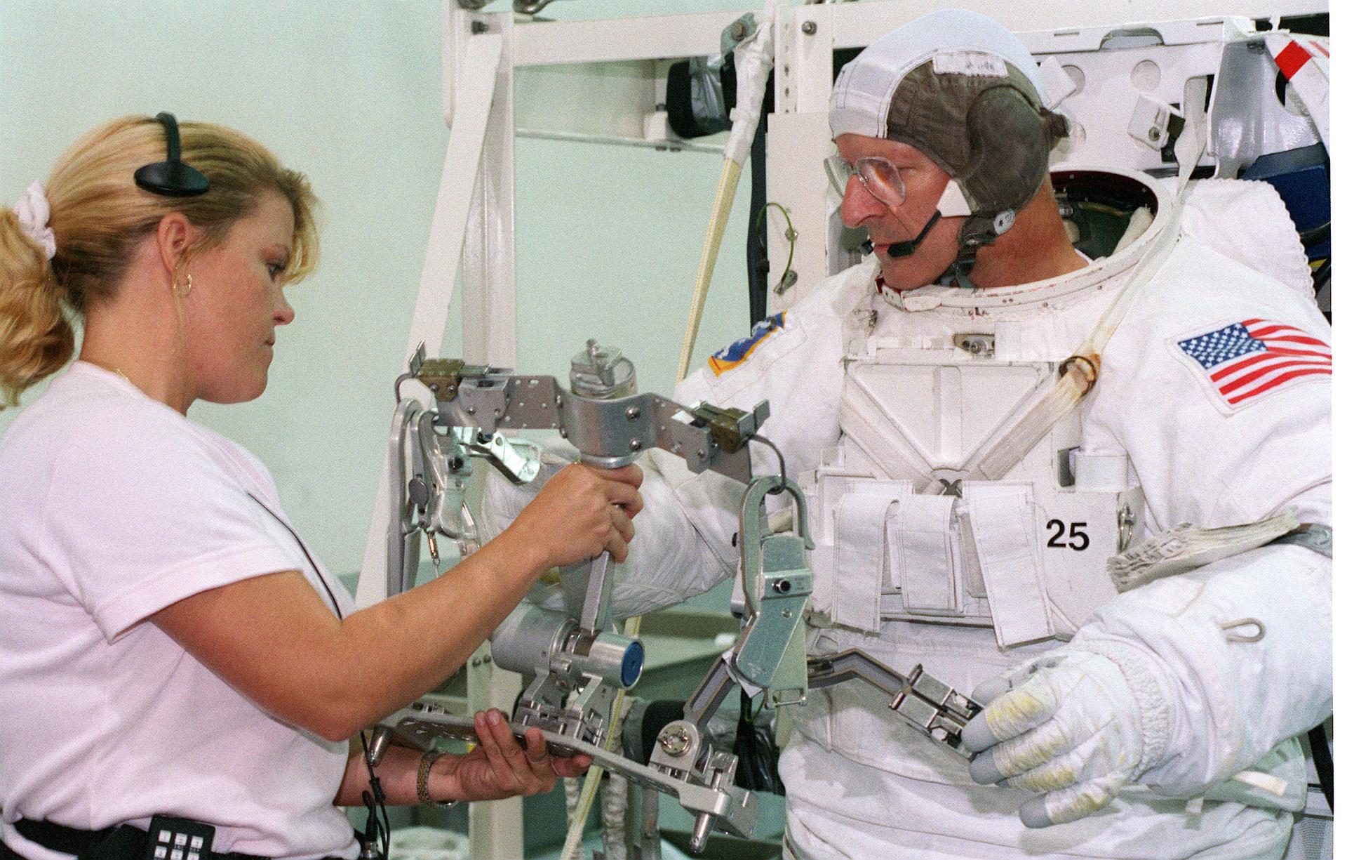 S99-08361 (26 July 1999) --- Astronaut Claude Nicollier, mission specialist representing the European Space Agency (ESA), readies gear for an underwater rehearsal of STS-103 exctravehicular activity (EVA). Nicollier and other astronauts assigned to space walk duty are in training for EVA chores they will handle when they make the third servicing visit to the Earth-orbiting Hubble Space Telescope (HST) since its deployment in April 1990.