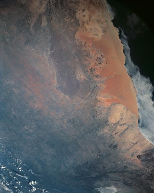One of the driest regions on Earth, the Namib Desert, Namibia, Africa (23.0N, 15.0E) lies adjacent to the Atlantic coast but the upwelling oceanic water causes a very stable rainless atmosphere. The few local inland rivers do not reach the sea but instead, appear as long indentations where they penetrate the dune fields and end as small dry lakes. The vast dune fields are the result of sands deposited over millions of years by the stream flow.