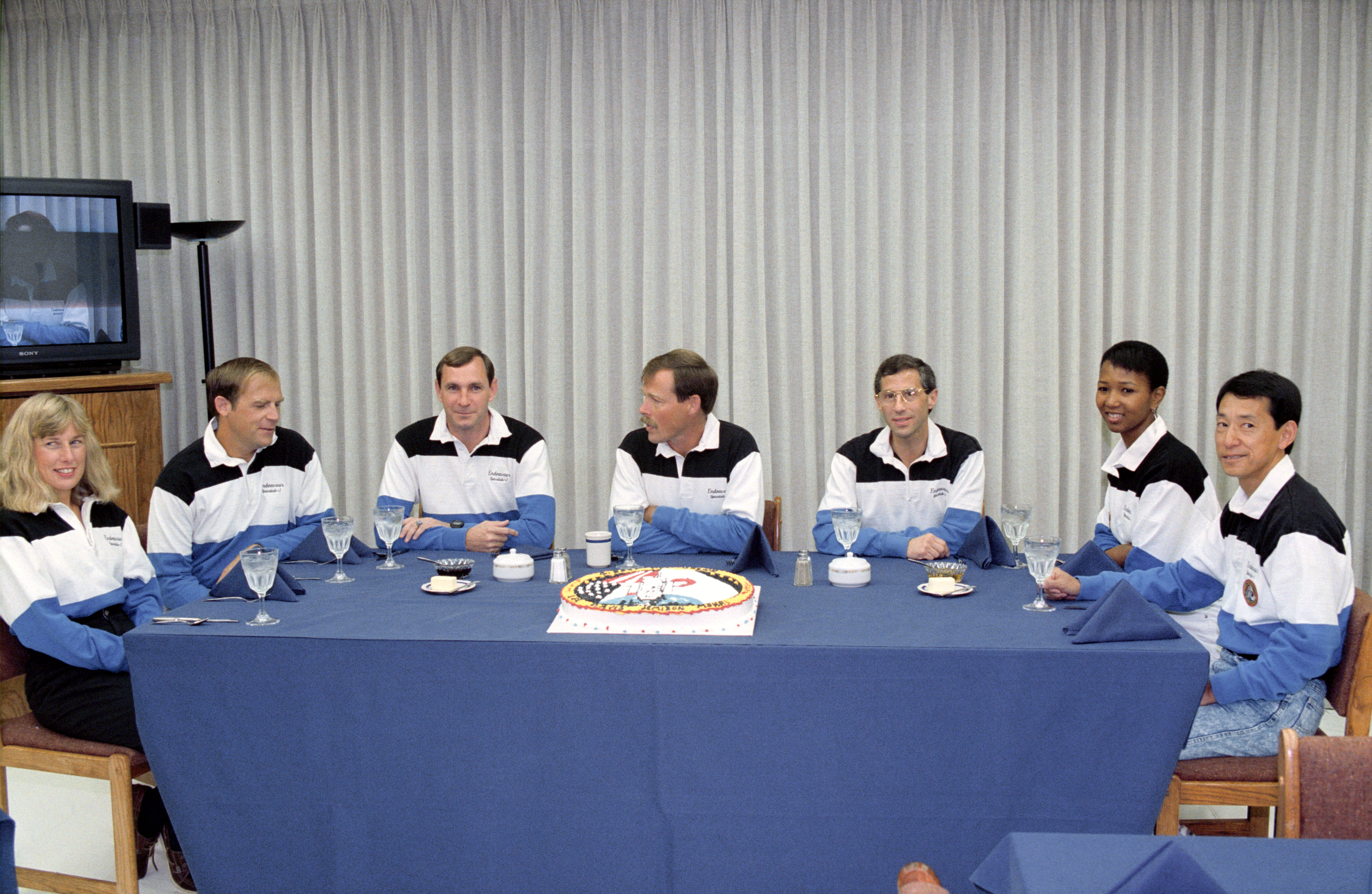 STS047-S-037 (12 Sept 1992) --- The seven crewmembers who will be aboard for Endeavour's second trip into space are about to have a light breakfast prior to the pre-launch suiting up process in the Operations and Checkout Building. Left to right are astronauts N. Jan Davis, Mark C. Lee, Curtis L. Brown Jr., Robert L. Gibson, Jerome (Jay) Apt and Mae C. Jemison; and payload specialist Mamoru Mohri, representing the National Space Development Agency (NASDA) of Japan. This mission will be devoted to support of the Spacelab-J mission, a joint effort between Japan and the United States. Launch occurred at 10:23:00:0680 a.m. (EDT), September 12, 1992.
