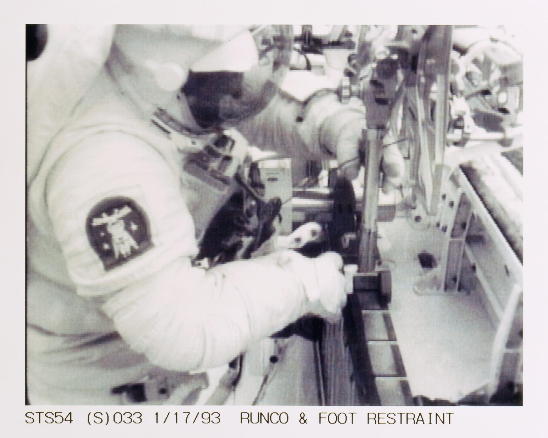 STS054-S-033 (17 Jan 1993) --- Runco works with a mobile foot restraint during extravehicular activity (EVA) in Endeavour's cargo bay. The scene was downlinked at 11:52:04:28 GMT, Jan. 17, 1993.