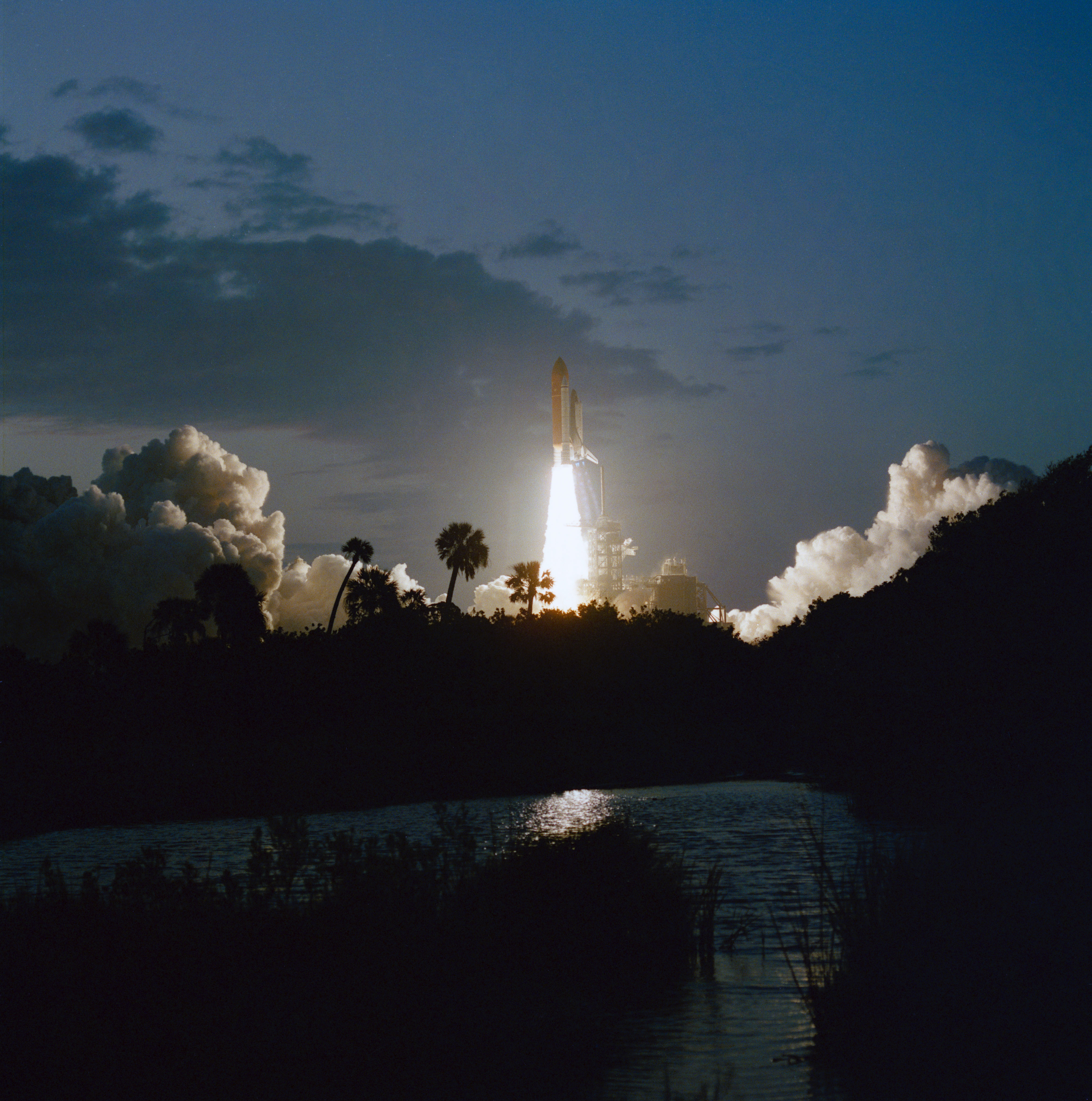 STS059-S-034 (9 April 1994) --- The liftoff of the Space Shuttle Endeavour is backdropped against a dawn sky at the Kennedy Space Center (KSC) as six NASA astronauts head for a week and a half in Earth orbit. Liftoff occurred at 7:05 a.m. (EDT), April 9, 1994. Onboard for the Space Radar Laboratory (SRL-1) mission were astronauts Sidney M. Gutierrez, Kevin P. Chilton, Jerome (Jay) Apt, Linda M. Godwin, Michael R. U. (Rich) Clifford and Thomas D. Jones.