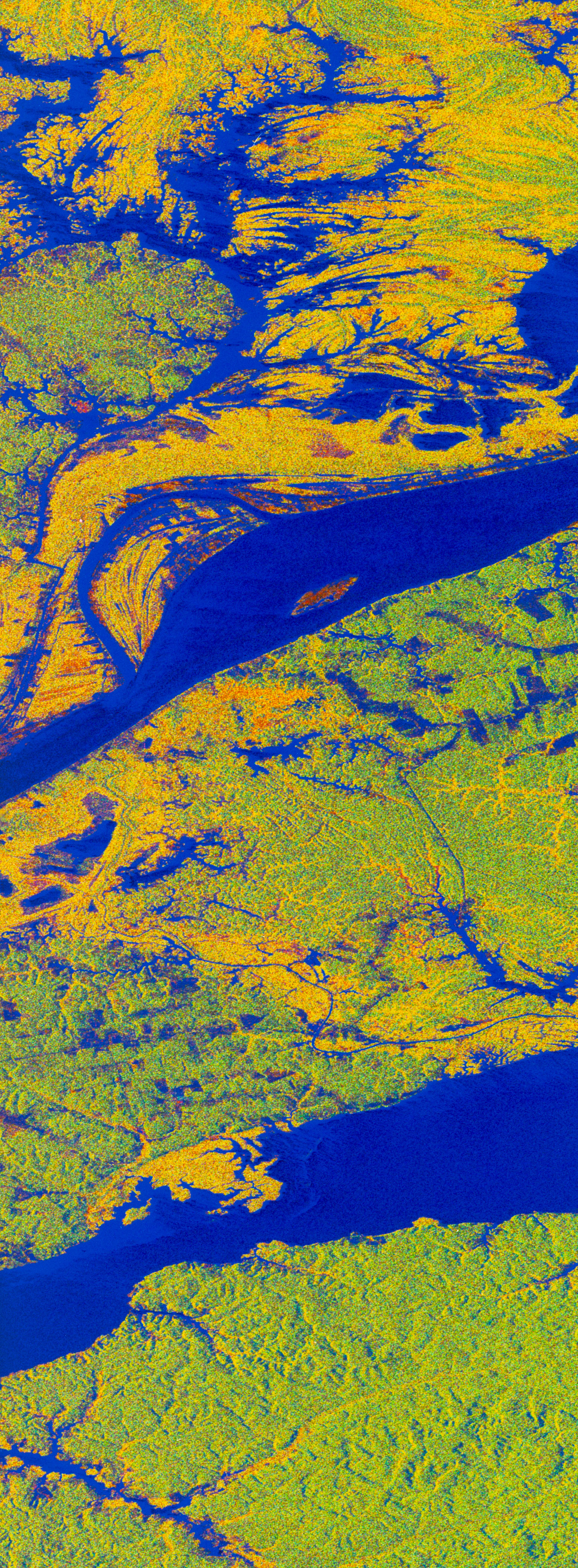STS059-S-068 (13 April 1994) --- This false-color L-Band image of the Manaus region of Brazil was acquired by the Spaceborne Imaging Radar-C and X-Band Synthetic Aperture Radar (SIR-C/X-SAR) aboard the Space Shuttle Endeavour on orbit 46 of the mission. The area shown is approximately 8 kilometers by 40 kilometers (5 by 25 miles). At the top of the image are the Solimoes and Rio Negro Rivers just before they combine at Manaus to form the Amazon River. The image is centered at about 3 degrees south latitude, and 61 degrees west longitude. The false colors are created by displaying three L-Band polarization channels; red areas correspond to high backscatter at HH polarization, while green areas exhibit high backscatter at HV polarization. Blue areas show low returns at VV polarization; hence the bright blue colors of the smooth river surfaces. Using this color scheme, green areas in the image are heavily forested, while blue areas are either cleared forest or open water. The yellow and red areas are flooded forest. Between Rio Solimoes and Rio Negro a road can be seen running from some cleared areas (visible as blue rectangles north of Rio Solimoes) north towards a tributary of Rio Negro. SIR-C/X-SAR is part of NASA's Mission to Planet Earth (MTPE). SIR-C/X-SAR radars illuminate Earth with microwaves allowing detailed observations at any time, regardless of weather or sunlight conditions. SIR-C/X-SAR uses three microwave wavelengths: L-Band (24 cm), C-Band (6 cm), and X-Band (3 cm). The multi-frequency data will be used by the international scientific community to better understand the global environment and how it is changing. The SIR-C/X-SAR data, complemented by aircraft and ground studies, will give scientists clearer insights into those environmental changes which are caused by nature and those changes which are induced by human activity. SIR-C was developed by NASA's Jet Propulsion Laboratory (JPL). X-SAR was developed by the Dornire and Alenia Spazio Companies for the German Space Agency, Deutsche Agentur fuer Raumfahrtangelegenheiten (DARA), and the Italian Space Agency, Agenzia Spaziale Italiana (ASI). JPL Photo ID: P-43895