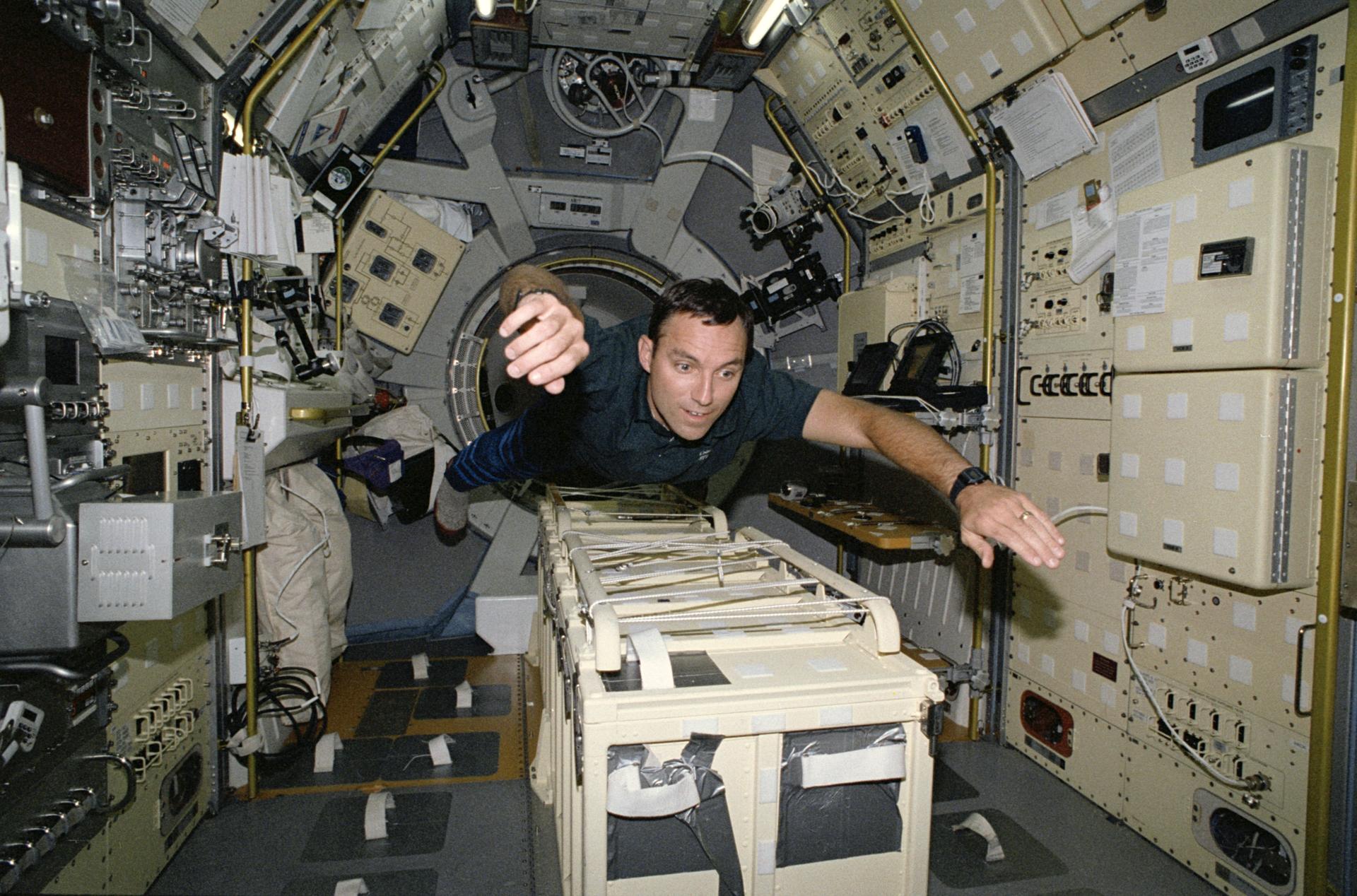 STS-65 Mission Specialist Carl E. Walz floats above center aisle equipment in the International Microgravity Laboratory 2 (IML-2) spacelab science module. Walz has just entered the IML-2 module via the spacelab tunnel (note hatch opening behind him). The tunnel connects the IML-2 module with Columbia's, Orbiter Vehicle (OV) 102's, crew compartment. Walz along with five other NASA astronauts and a Japanese payload specialist spent more than two weeks in Earth orbit conducting IML-2 experiments. This photo was among the first released by NASA following IML-2.