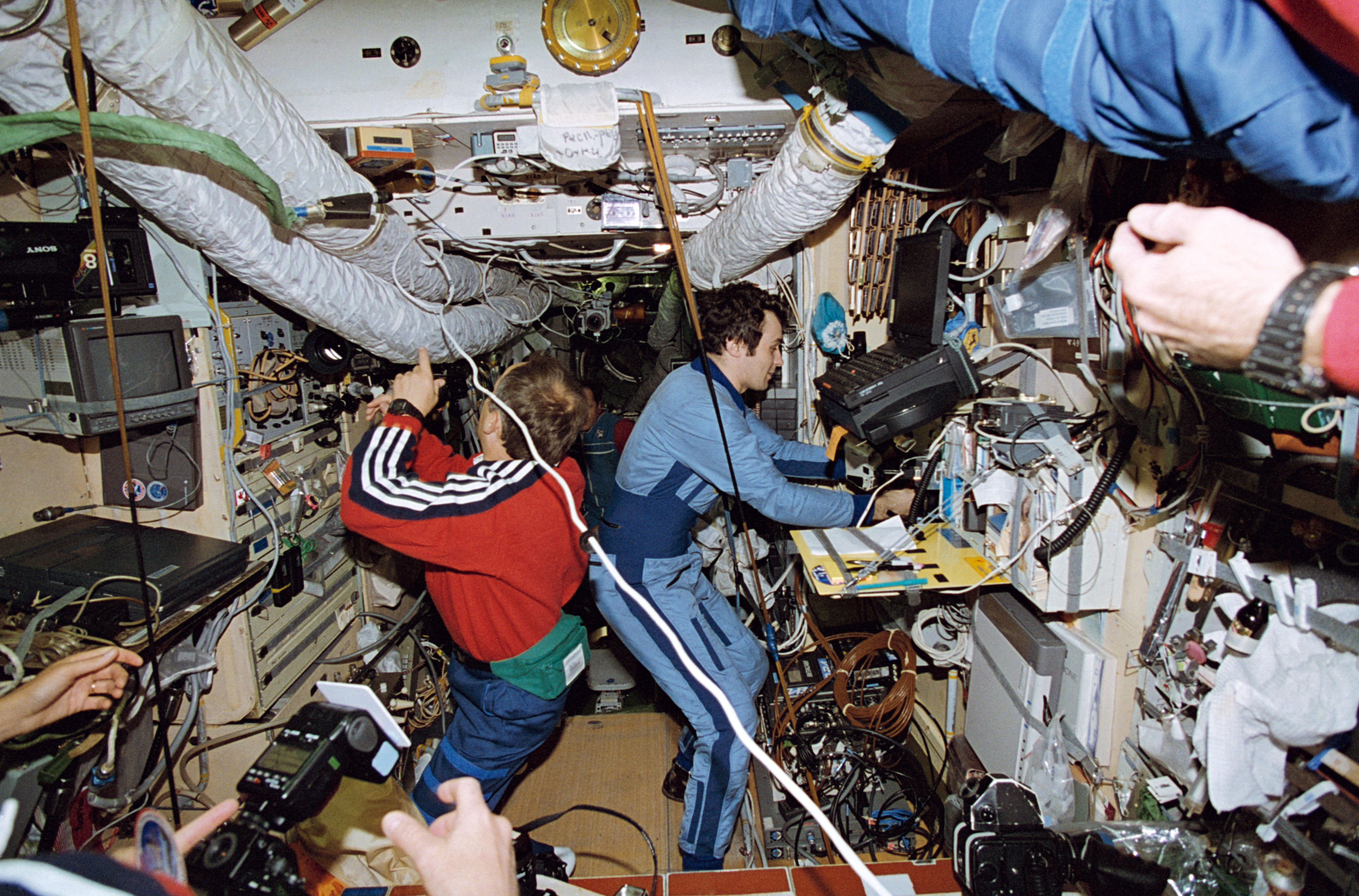 STS071-118-007 (27 June - 7 July 1995) --- Onboard the Russia?s Mir Space Station Mir Base Block, cosmonauts Anatoly Y. Solovyev (left) and Vladimir N. Dezhurov, Mir 19 and 18 commanders, respectively, exchange information about their research tasks. The two represent a change of guard aboard Mir, as Dezhurov prepares to come back to Earth with the STS-71 crew aboard Space Shuttle Atlantis. Nikolai M. Budarin and Gennadiy M. Strekalov - cosmonaut/flight engineers making the same exchange -- are out of frame.