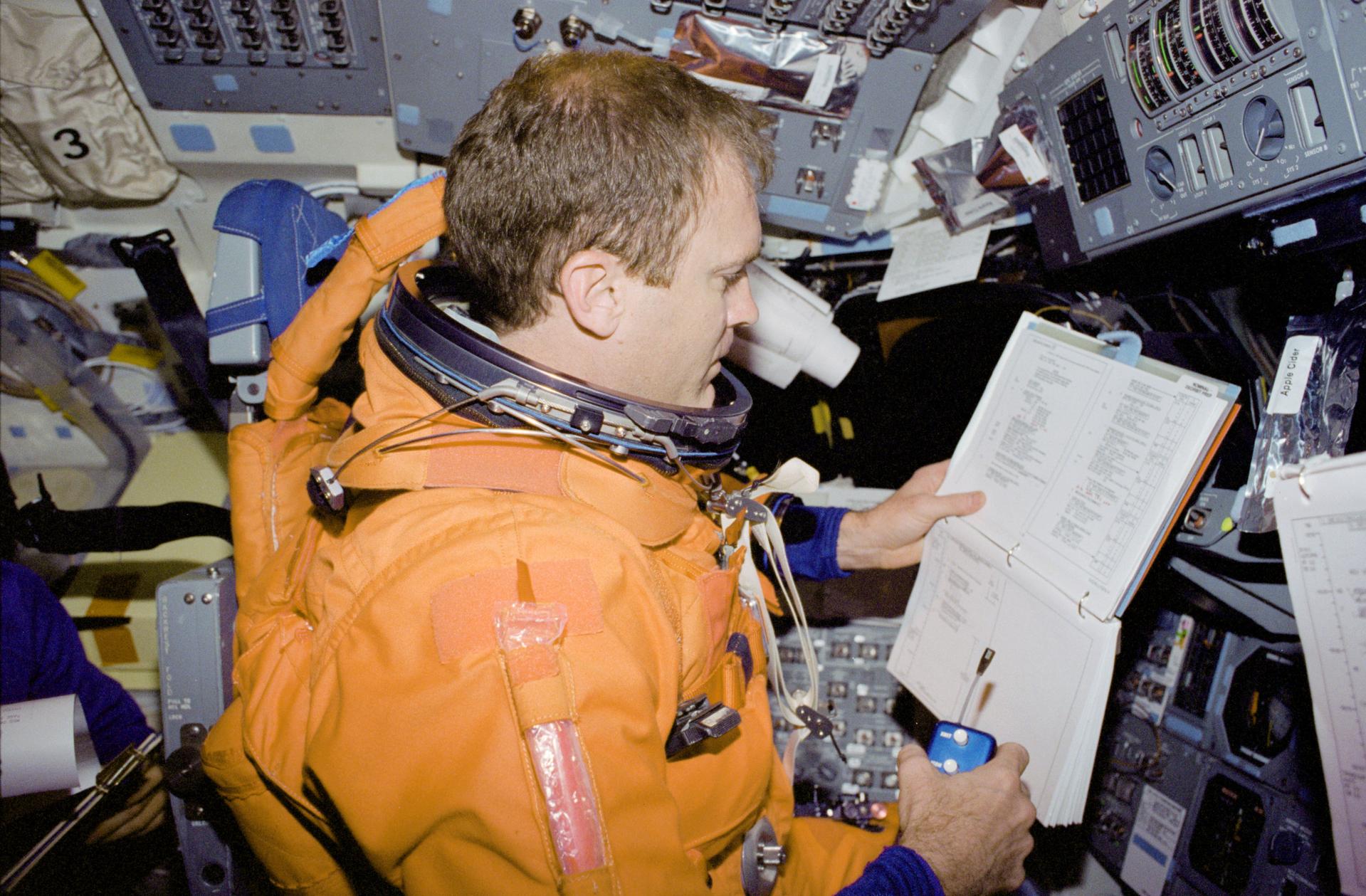 STS083-448-025 (8 April 1997) --- Partially suited in the partial-pressure launch and entry garment, astronaut James D. Halsell, Jr., mission commander, goes over a checklist prior to entry. Halsell, along with four other NASA astronauts and two payload specialists supporting the Microgravity Sciences Laboratory (MSL-1) mission were less than a fourth of the way through a scheduled 16-day flight when a power problem cut short their planned stay.