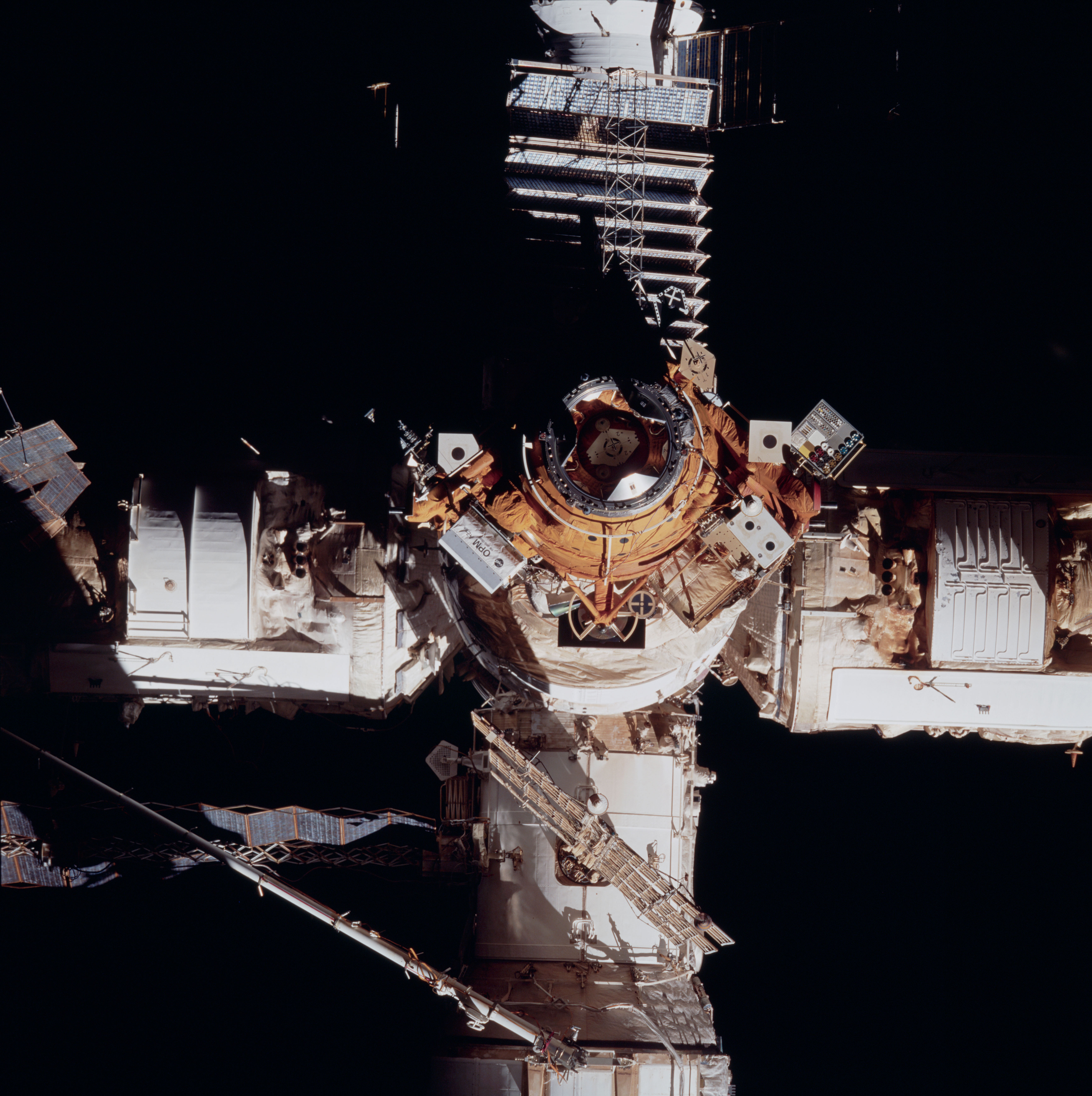 STS084-730-002 (15-24 May 1997) --- A Space Shuttle Atlantis point-of-view frame showing the docking port and target during separation from with Russia's Mir Space Station. The picture should be held with the retracted Kristall solar array at right. Other elements partially visible are Kvant-2 (top), Spektr (bottom) and Core Module (left).