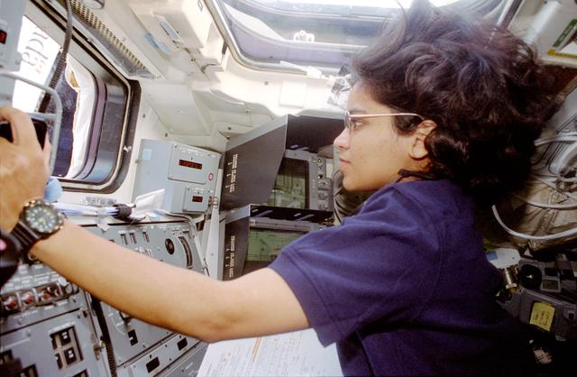 STS087-357-019 (19 November - 5 December 1997) --- Astronaut Kalpana Chawla, mission specialist, operates Columbia's Remote Manipulator System (RMS) on the aft flight deck during operations with the Spartan 201 satellite. Chawla joined four other astronauts and a Ukrainian payload specialist for 16-days of research in Earth-orbit in support of the United States Microgravity Payload 4 (USMP-4) mission.