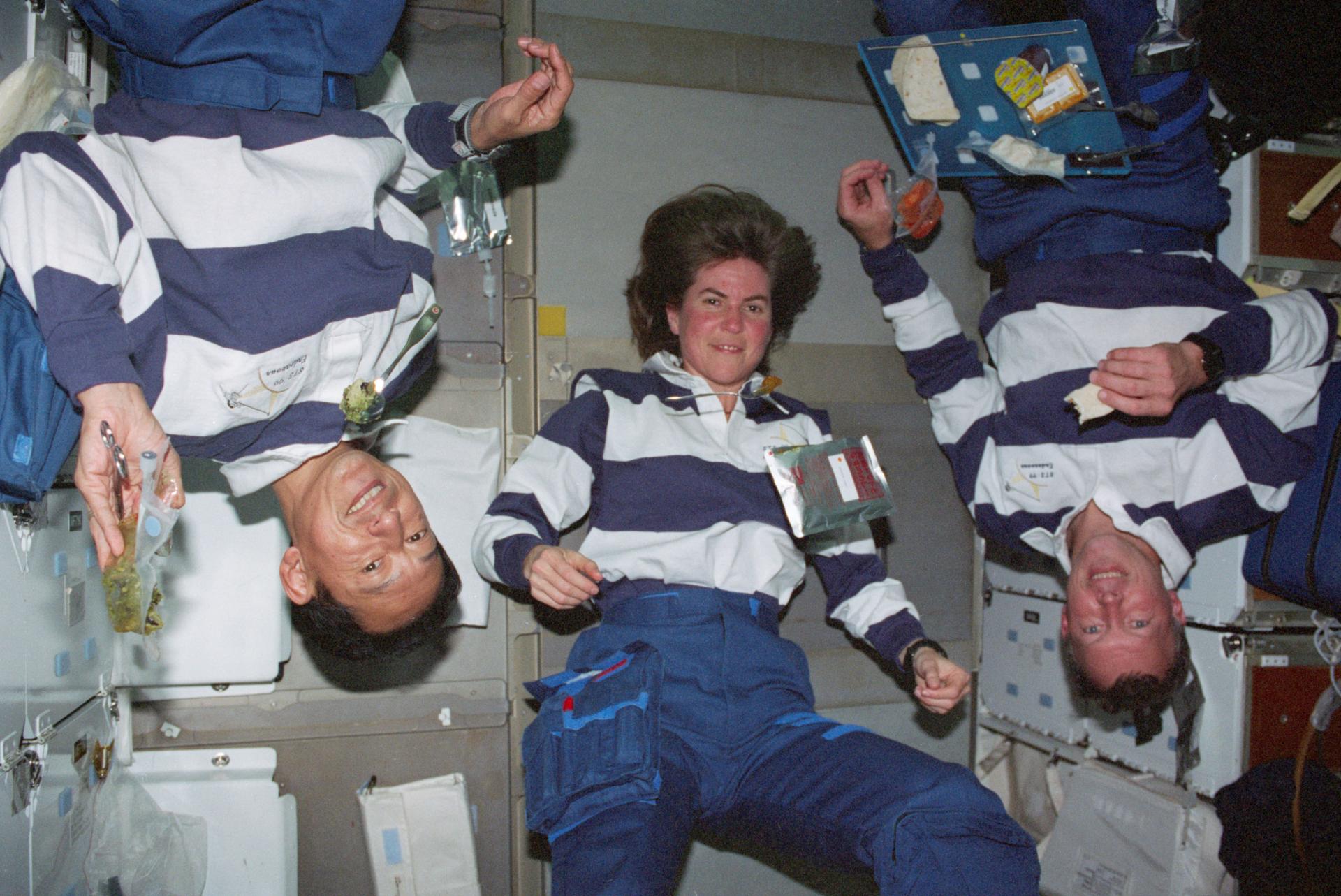STS099-312-002 (11-22 February 2000) ---Astronauts Mamoru Mohri (left), Janice E. Voss, and Dominic L. Gorie, members of the Blue Team portion of 24-hour Shuttle Radar Topography Mission (SRTM) support, prepare for a meal on the middeck of the Space Shuttle Endeavour. Mohri represents Japan?s National Space Development Agency (NASDA).