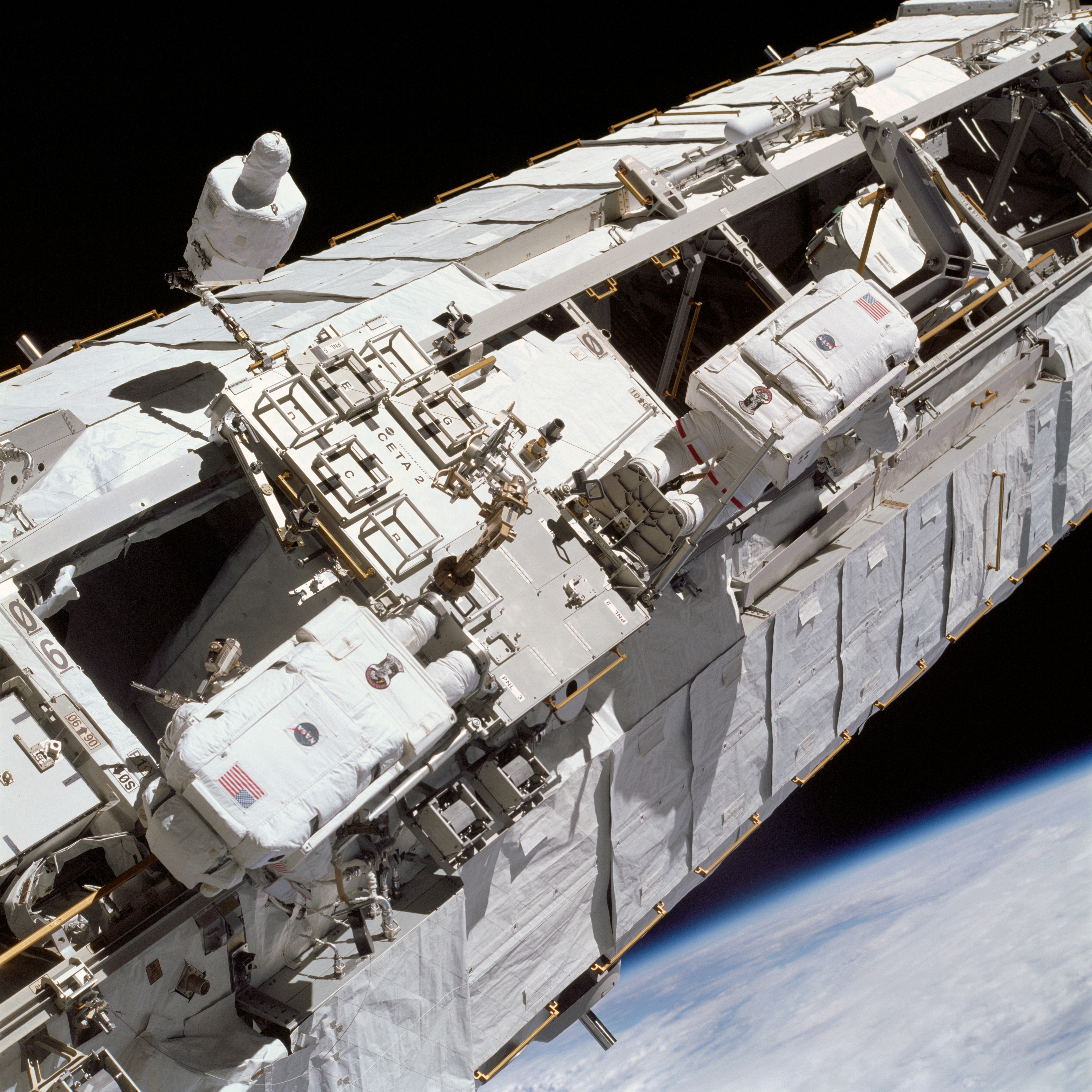 STS113-714-024 (26-30 November 2002) --- Astronauts Michael E. Lopez-Alegria (right) and John B. Herrington, STS-113 mission specialists, work near the Crew and Equipment Translation Aid (CETA) cart on a truss on the International Space Station (ISS) during a scheduled spacewalk for the mission.