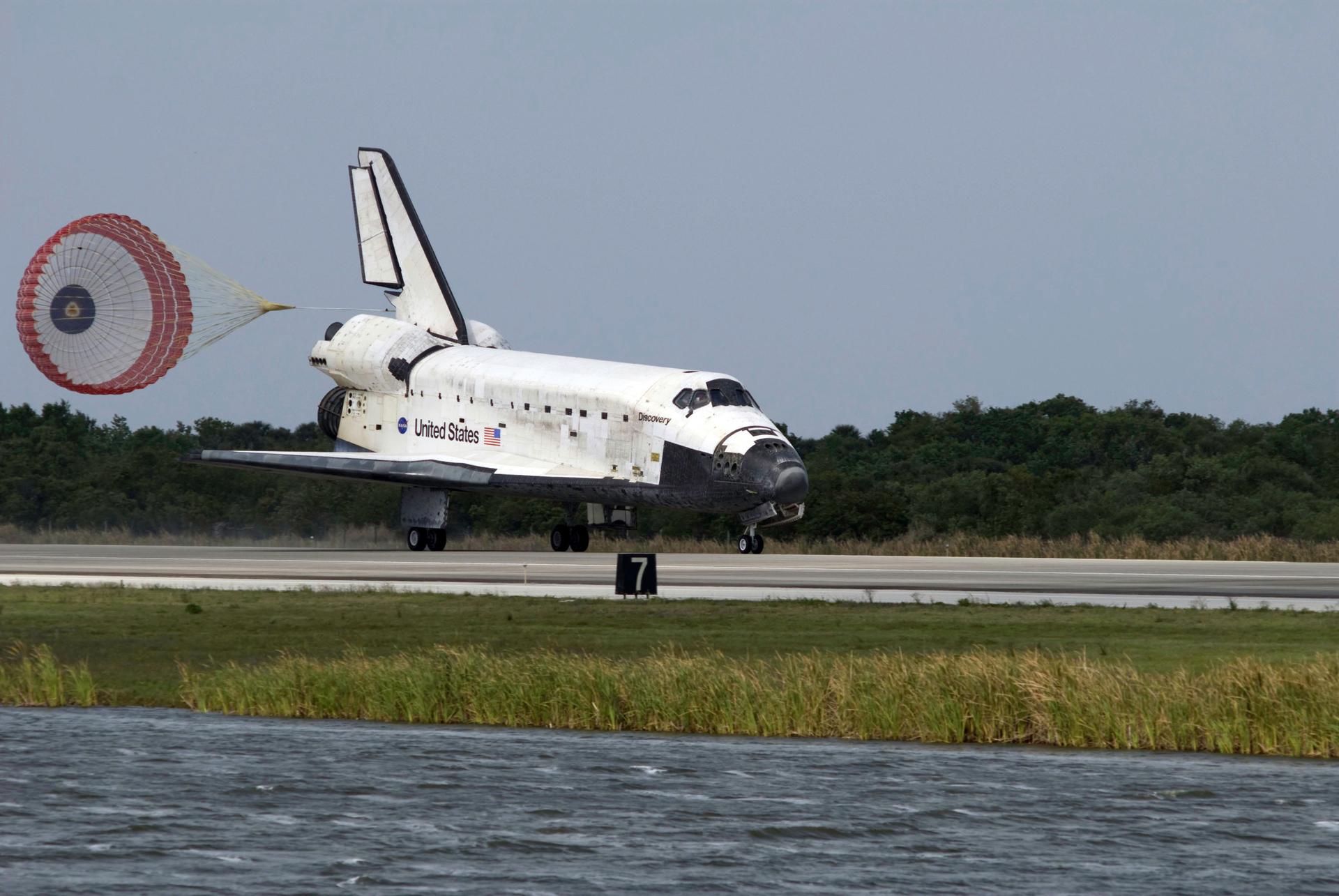 STS119-S-061 (28 March 2009) --- Space Shuttle Discovery?s drag chute is deployed as the spacecraft rolls toward wheels stop on Runway 15 of the Shuttle Landing Facility at NASA's Kennedy Space Center, concluding the 13-day, 5.3-million mile journey of the STS-119 mission to the International Space Station. Onboard are NASA astronauts Lee Archambault, commander; Tony Antonelli, pilot; Steve Swanson, Richard Arnold, Joseph Acaba, John Phillips and Sandra Magnus, all mission specialists. The main landing gear touched down at 3:13:17 p.m. (EDT) on March 28, 2009. The nose gear touched down at 3:13:40 p.m. and wheels stop was at 3:14:45 p.m. During the mission, Discovery?s crew delivered and installed the final pair of large power-generating solar array wings and the S6 truss segment to the starboard, or right, side of the station and accomplished important tasks to prepare the station for future upgrades and additions later this year.