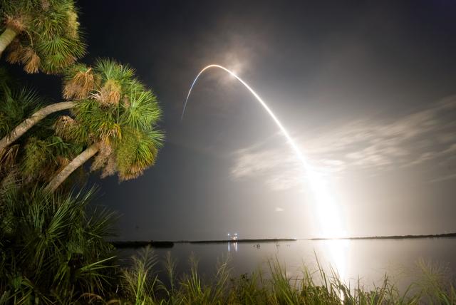 STS128-S-011 (28 Aug. 2009) --- Viewed from the Banana River Viewing Site, Space Shuttle Discovery and its seven-member STS-128 crew head toward Earth orbit and rendezvous with the International Space Station (ISS). Liftoff was on time at 11:59 p.m. (EDT) on Aug. 28, 2009 from launch pad 39A at NASA?s Kennedy Space Center. Onboard are astronauts Rick Sturckow, commander; Kevin Ford, pilot; John ?Danny? Olivas, European Space Agency astronaut Christer Fuglesang, Patrick Forrester, Jose Hernandez and Nicole Stott, all mission specialists. Stott will join Expedition 20 in progress to serve as a flight engineer aboard the ISS. The 13-day mission will deliver more than seven tons of supplies, science racks and equipment, as well as additional environmental hardware to sustain six crew members on the space station. The equipment includes a freezer to store research samples, a new sleeping compartment and the COLBERT treadmill. The mission is the 128th in the Space Shuttle Program, the 37th flight of Discovery and the 30th station assembly flight.