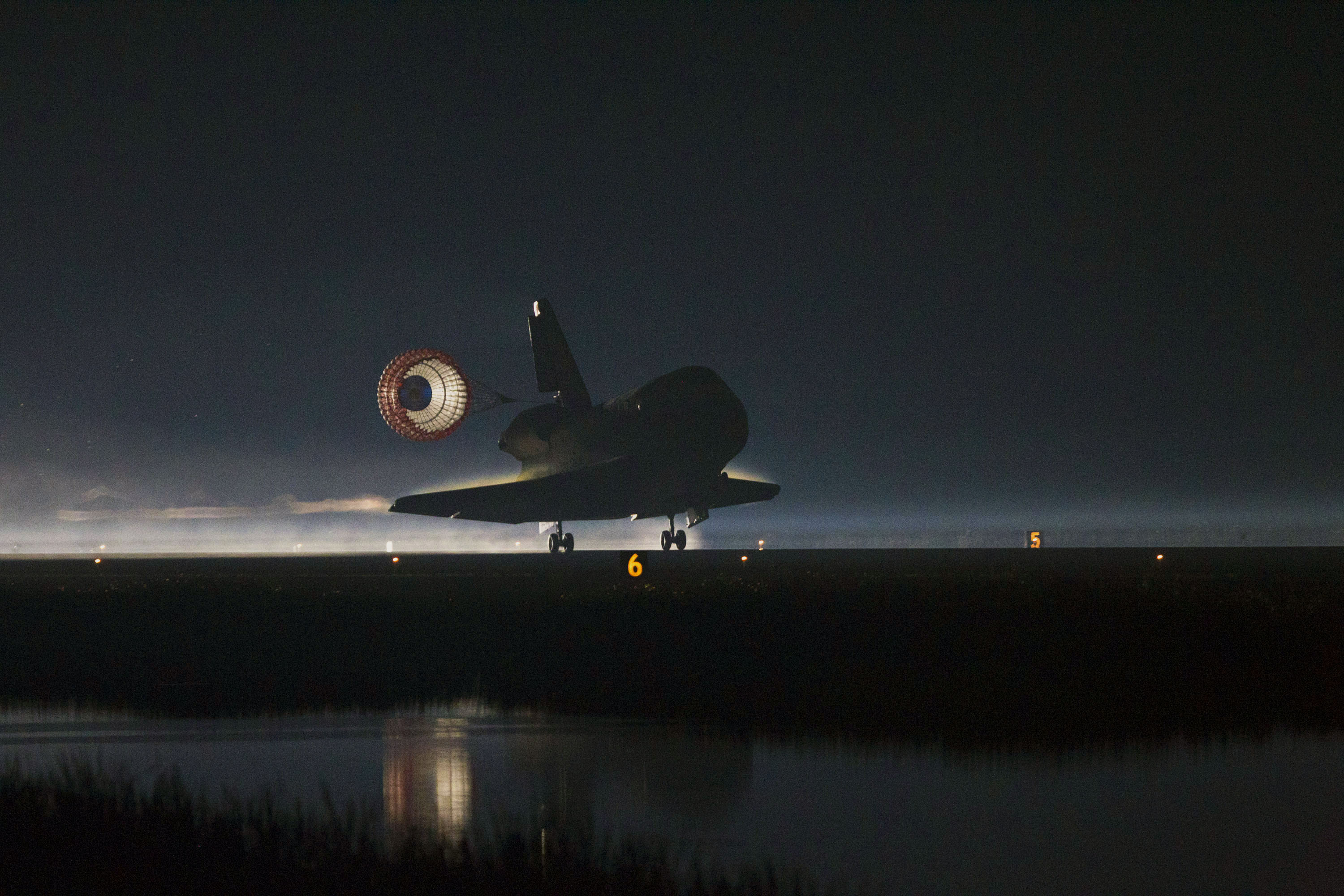 STS135-S-252 (21 July 2011) --- Space shuttle Atlantis' drag chute slows the shuttle as it lands on Runway 15 at the Shuttle Landing Facility at NASA's Kennedy Space Center in Florida. Securing the space shuttle fleet's place in history, Atlantis marked the 26th nighttime landing of NASA's Space Shuttle Program and the 78th landing at Kennedy. Main gear touchdown was at 5:57:00 a.m. (EDT) on July 21, 2011, followed by nose gear touchdown at 5:57:20 a.m., and wheelstop at 5:57:54 a.m. Onboard are NASA astronauts Chris Ferguson, STS-135 commander; Doug Hurley, pilot; Sandy Magnus and Rex Walheim, both mission specialists. On the 37th shuttle mission to the International Space Station, STS-135 delivered more than 9,400 pounds of spare parts, equipment and supplies in the Raffaello multi-purpose logistics module that will sustain station operations for the next year. STS-135 was the 33rd and final flight for Atlantis, which has spent 307 days in space, orbited Earth 4,848 times and traveled 125,935,769 miles. Photo credit: NASA