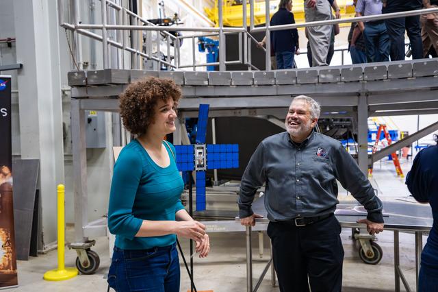 Two Kennedy Space Center employees engage in conversation during an innovation showcase on Nov. 19, 2019, in the...